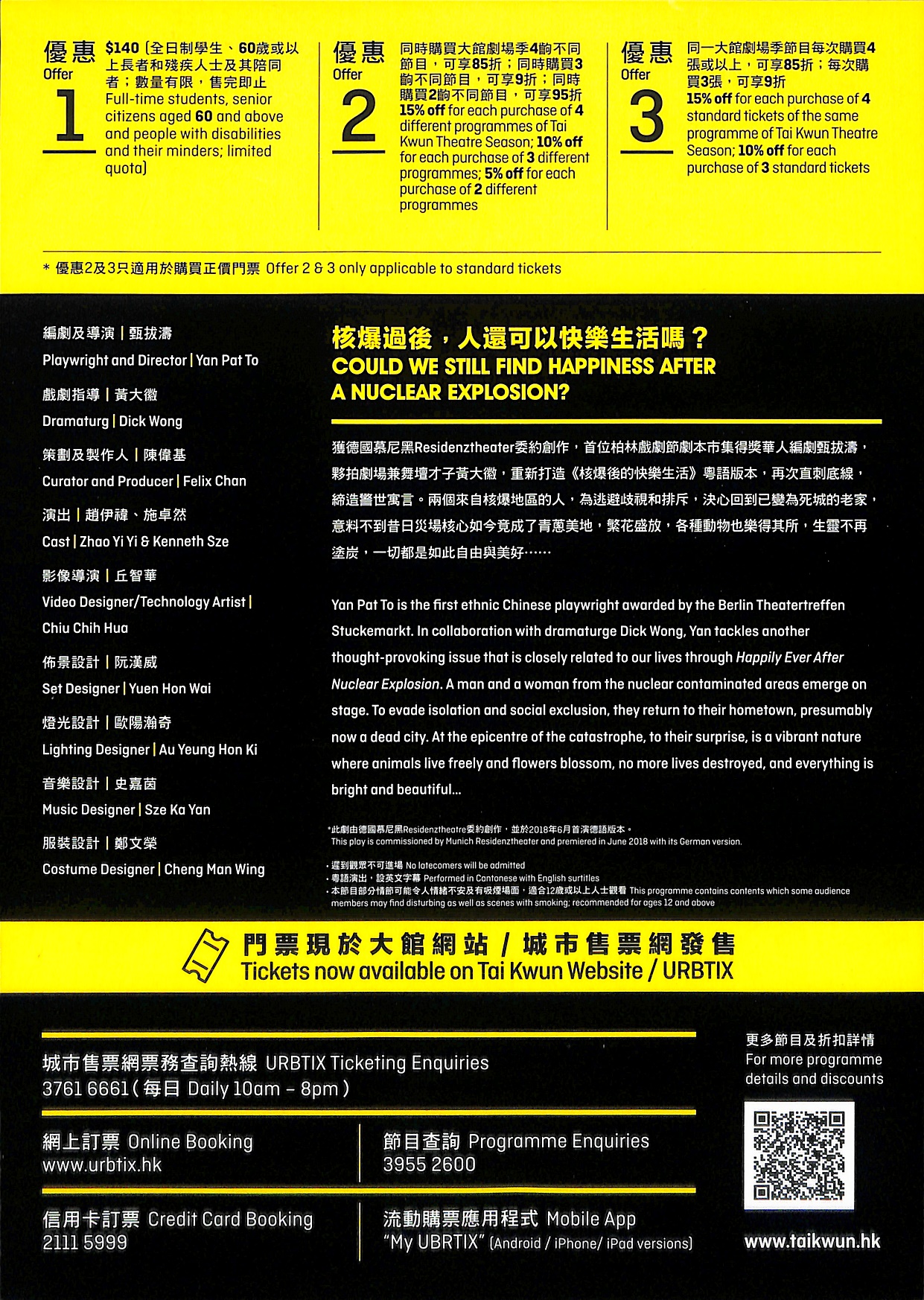 首位獲柏林戲劇節劇本市集獎的華人編劇甄拔濤,繼得獎作品《未來簡史》後再次直刺底線,打造警世寓言。夥拍劇場兼舞壇才子黃大徽重新打造的《核爆後的快樂生活》粵語版本,透過物件陳設、錄影片段及裝置,帶領觀眾遊走於文字與科技之間,親歷核爆後的世界。