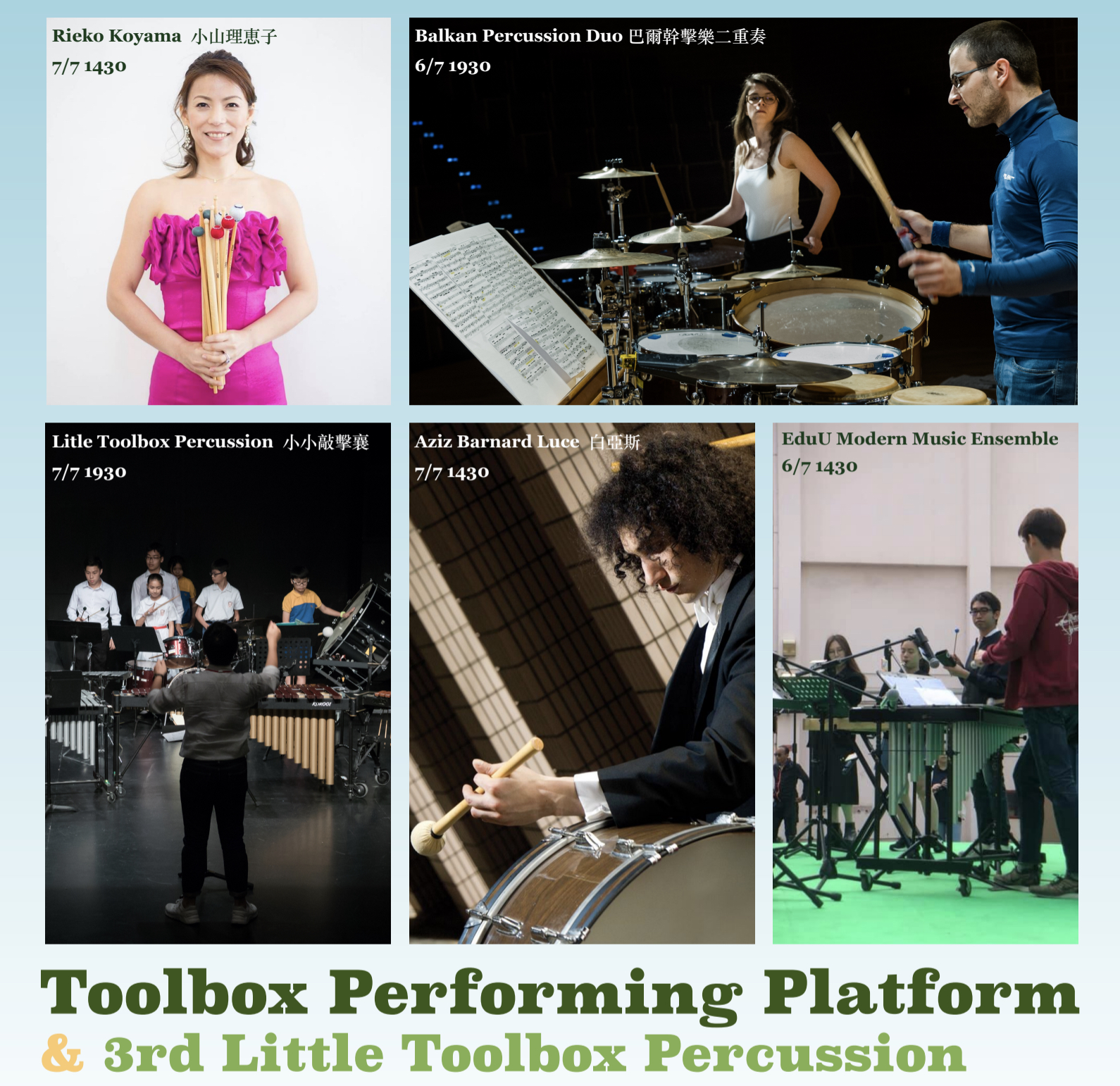 《⼩小敲擊襄》 將給予學員感受一下⾳樂分享與敲擊樂隊的演出經驗。 來⾃本港多間學校的敲擊⼩樂樂手將會共同演出⼀系列列經典敲擊樂作品,可讓大家於暑假前總結⼀年的學習成果。