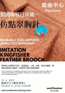 戲曲演員在舞台上穿戴的首飾,能反映角色的身份地位和個性。它融合古代中國首飾的特點,部分使用點翠、金銀絲細工、縷空和花鈿等傳統技法。其中點翠工藝以翠鳥羽毛作素材,鑲嵌於金屬底座上,多用作表現皇室、將相、官家小姐等身份。是次工作坊中導師將以絲帶替代羽毛,跟參加者一起動手設計、抽絲、上漿、烘乾、黏合及鑲嵌,製作一個具時代感的仿點翠胸針。