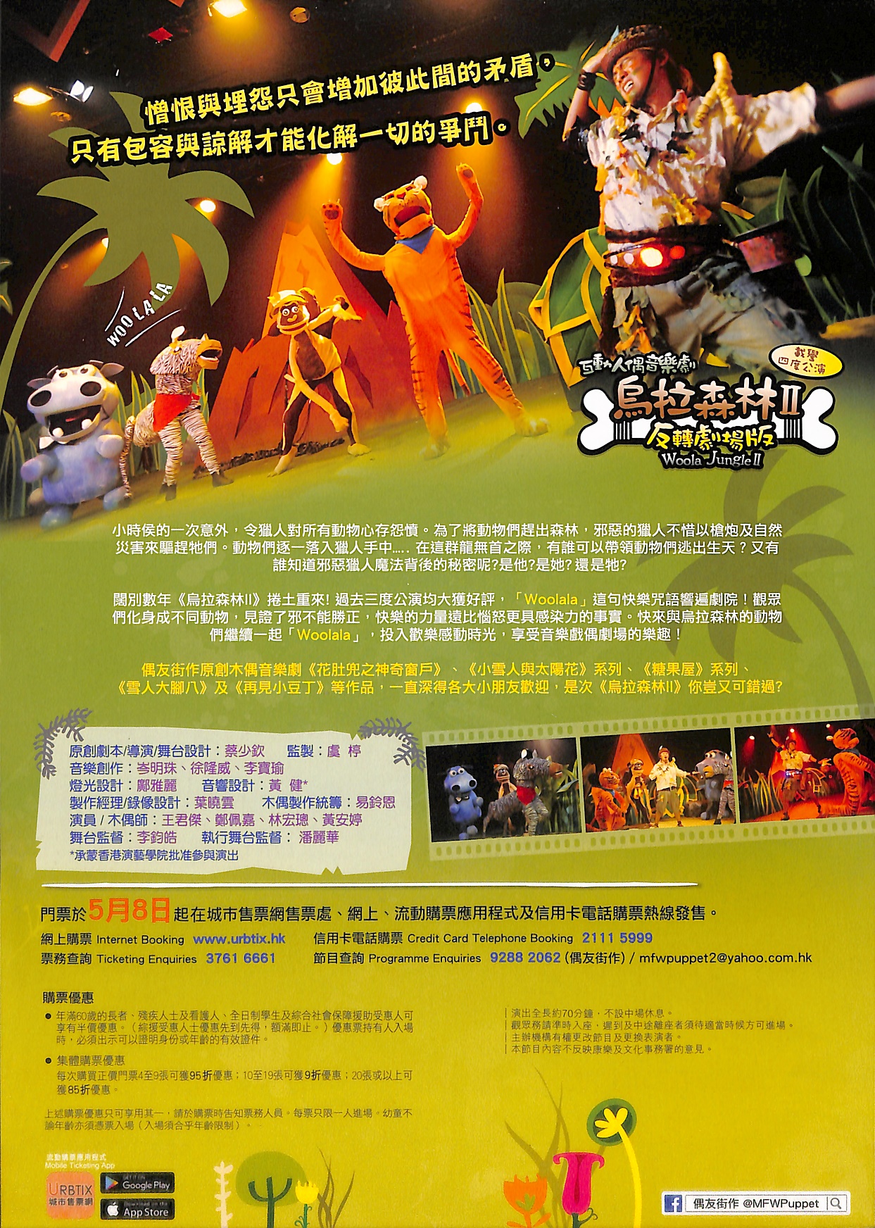 闊別數年, 捲土重來, 載譽四度重演! 過去三度公演均全院滿座,「Woolala」這句快樂咒語響遍劇院!觀眾們化身成不同動物,見證了邪不能勝正,快樂的力量遠比惱怒更具感染力的事實。快來與烏拉森林的動物們繼續一起「Woolala」,投入歡樂感動時光,享受音樂戲偶劇場的樂趣!