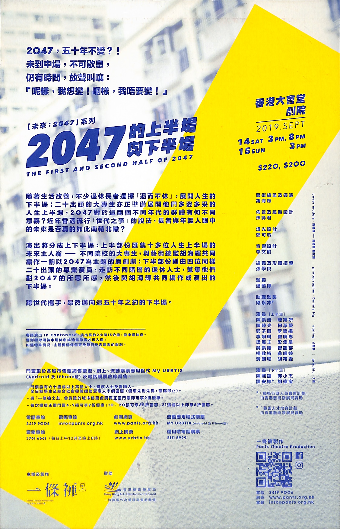 演出將分成上下半場,上半部份匯集十多位人生上半場的未來主人翁-不同院校的大專生,與藝術總監胡海輝共同編作一齣以2047為主題的原創劇;下半部份則由四位同樣二十出頭的專業演員,走訪不同階層的退休人士,䈭集他們對2047的所思所感,然後與胡海輝共同編作成演出的下半場。