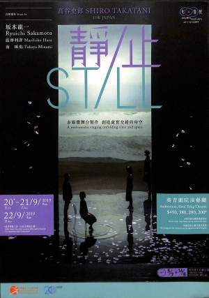 日本前衛藝術家及「蠢蛋一族」創團成員高谷史郎創作的多媒體演出,以精彩的視覺場面引領觀眾探索時間和空間的概念。《靜/止》舞台猶如一面鏡子,映照著投射在屏幕上的密集影像和舞台上表演者的一舉一動,帶觀眾進入自我催眠的狀態。曾獲奧斯卡金像獎的作曲大師坂本龍一連同原摩利彥、南 琢也創作配合演出的音樂和音效。參與演出的鶴田真由曾獲日本電影學院獎最佳女配角提名。