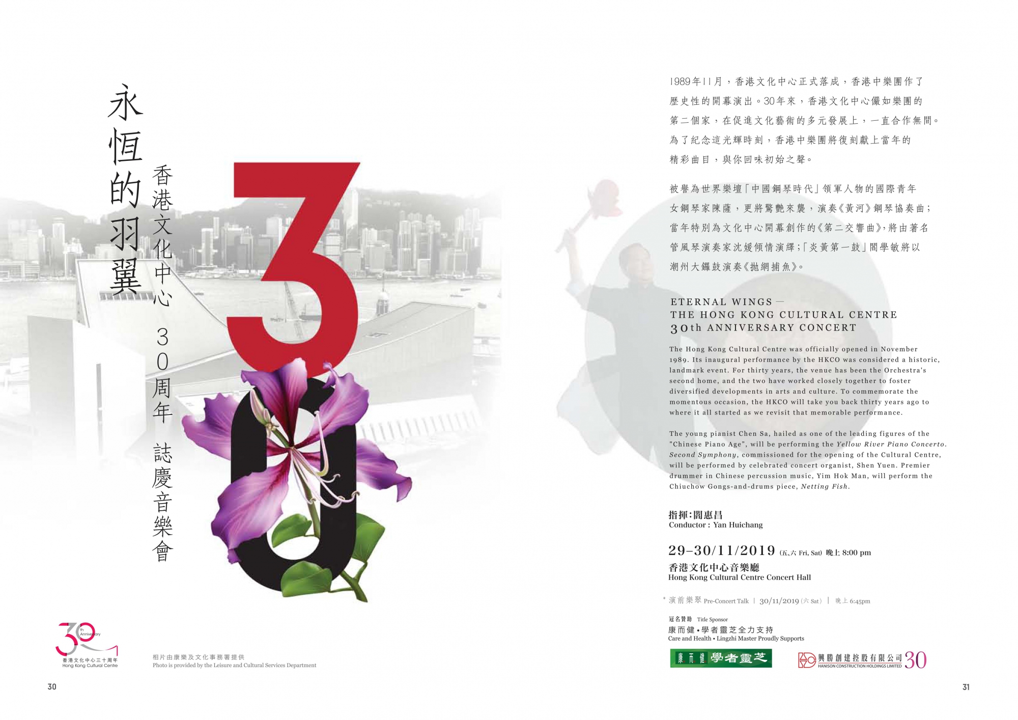 1989 年11月,香港文化中心正式落成,香港中樂團作了歷史性的開幕演出。30年來,香港文化中心儼如樂團的第二個家,在促進文化藝術的多元發展上,一直合作無間。為了紀念這光輝時刻,香港中樂團將復刻獻上當年的精彩曲目,與你回味初始之聲。