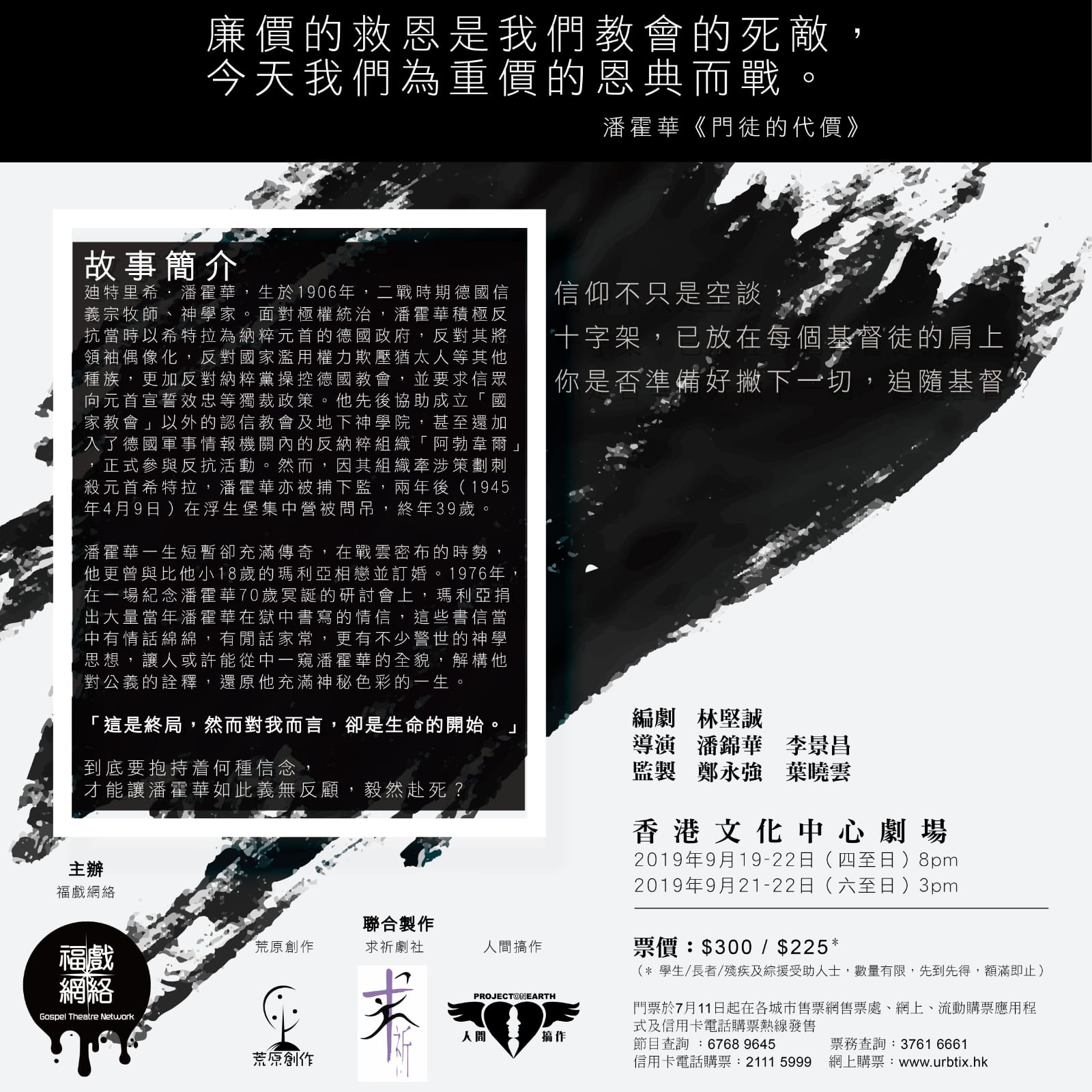 廸特里希.潘霍華,生於1906年,二戰時期德國信義宗牧師、神學家。面對極權統治,潘霍華積極反抗當時以希特拉為納粹元首的德國政府,反對其將領袖偶像化,反對國家濫用權力欺壓猶太人等其他種族,更加反對納粹黨操控德國教會並要求信眾向元首宣誓效忠等獨裁政策。他先後協助成立「國家教會」以外的認信教會及地下神學院,甚至還加入了德國軍事情報機關內的反納粹組織「阿勃韋爾」,正式參與反抗活動。然而,因其組織牽涉策劃刺殺元首希特拉,潘霍華亦被捕下監,兩年後(1945年4月9日)在浮生堡集中營被問吊,終年三十九歲。