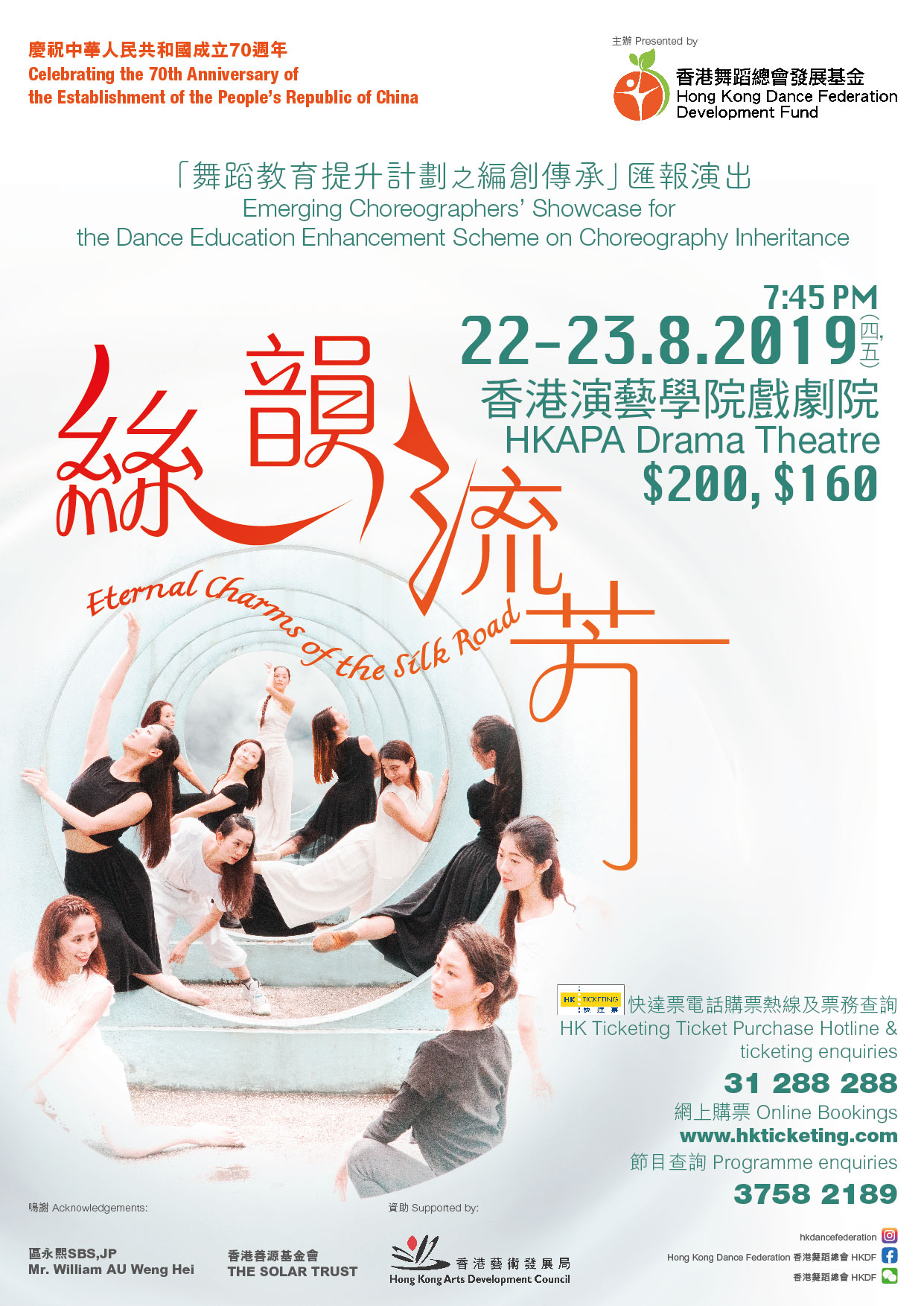 《絲韻流芳》是由北京舞蹈學院張建民教授主導,12位本地不同團體的年青編舞,在資深導師帶領下,創作一系列以絲路文化為主題的全新節目。今次演出為「舞蹈編創傳承課程」之年青編舞學員成品。學員在導師引領下學習如何將理論運用於舞蹈創作上,期間課程導師及團內導師給予各人輔導及支持。這成果是學員以理論帶動動作設計,將虛無主題變成實質舞碼的一次歷練。