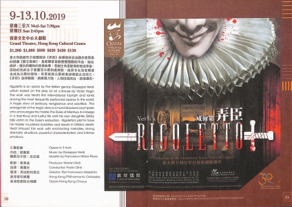 意大利歌劇天才威爾第的《弄臣》故事取材自法國作家雨果的話劇《國王取樂》。《弄臣》是威爾第首齣蜚聲國際的作品,結合嫉妒、復仇和犧牲的悲慘故事。悲劇主角是駝背的宮廷弄臣,因助好色的主子曼圖亞公爵到處尋歡,結果令女兒吉爾達也成為公爵的獵物。弄臣欲殺公爵報復卻導致女兒死亡。《弄臣》旋律動聽,戲劇張力強,人物性格突出,感情濃烈。