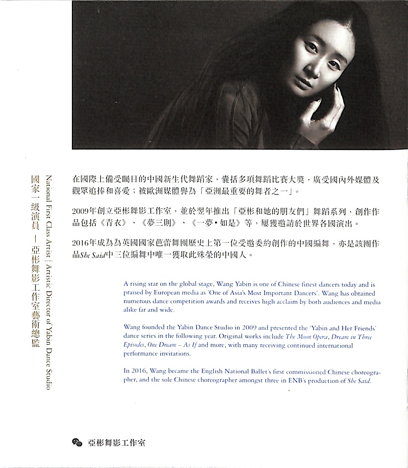 改編自茅盾文學獎得主畢飛宇同名小說,舞劇《青衣》台前幕後陣容強大,由多國知名藝術家攜手設計,呈現極致簡約舞台,打造嶄新視聽效果,並由國家一級演員王亞彬導演及編舞,融合中國古典舞、現代舞及傳統京劇元素,在東西方文化中重塑舞蹈之美。是次香港首演,香港舞蹈團與亞彬舞影工作室,兩地舞者將敞開心扉,照見自身。