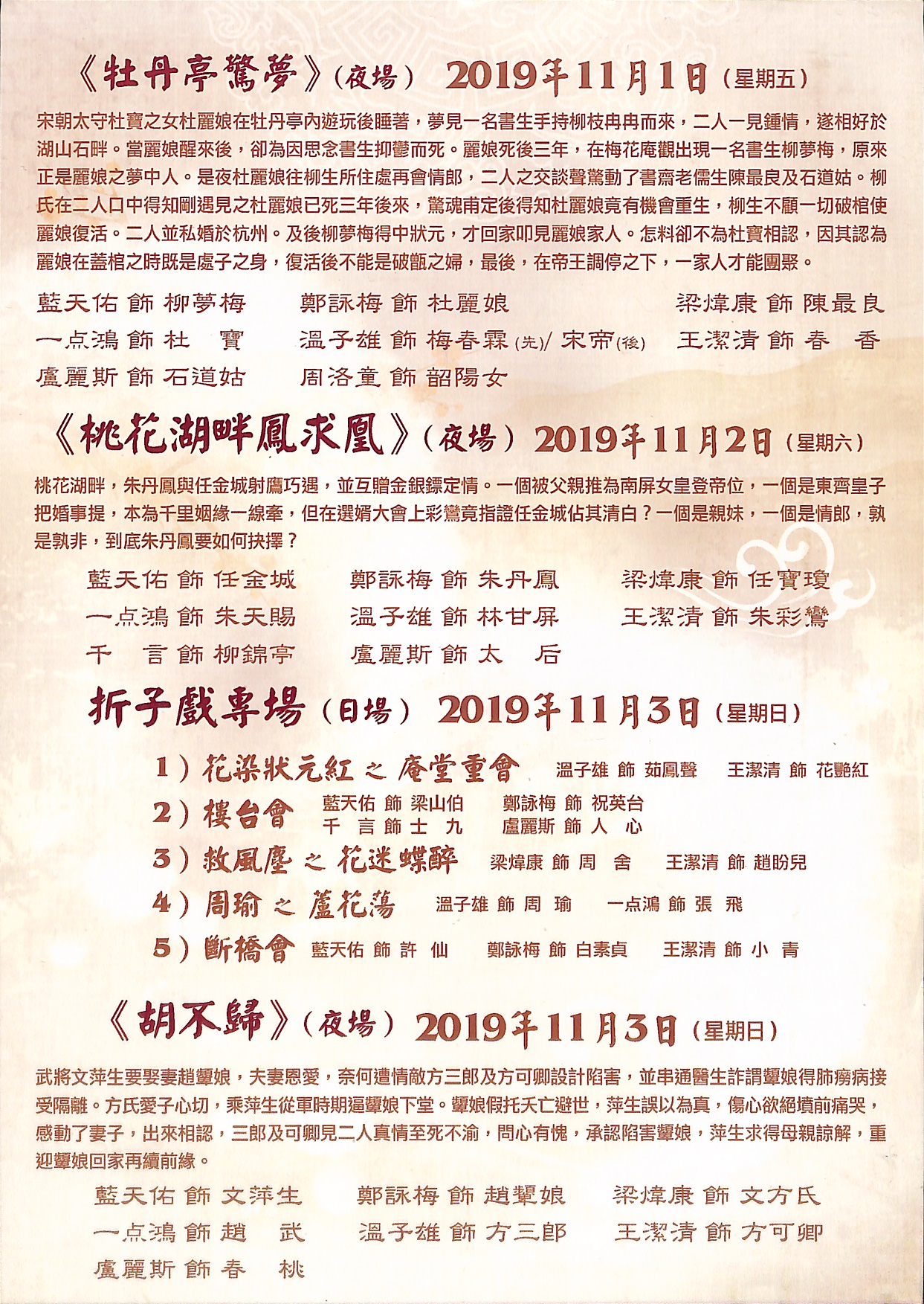 宋朝太守杜寶之女杜麗娘在牡丹亭內遊玩後睡著,夢見一名書生手持柳枝冉冉而來,二人一見鍾情,遂相好於湖山石畔。當麗娘醒來後,卻為因思念書生抑鬱而死。