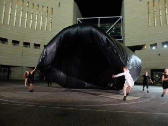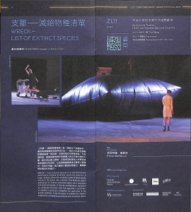 《支離-滅絕物種清單》是一場融合了遷移、聲效和視覺藝術的跨界別作品。一個巨大的黑色塑膠軟雕塑就像一個枕頭,充滿空氣在空間裡移動。作為捕捉者,這個抽象的物件有著攝人 而又充滿共鳴的力量。 當它吞吐著人類時,它被視為利維坦人的寓言或海底傳說中的怪物,又或是暗喻著資本主義或人類境況。同時它有著一股力量放大觀眾的想像力、擴闊聯想和概念化的層次。