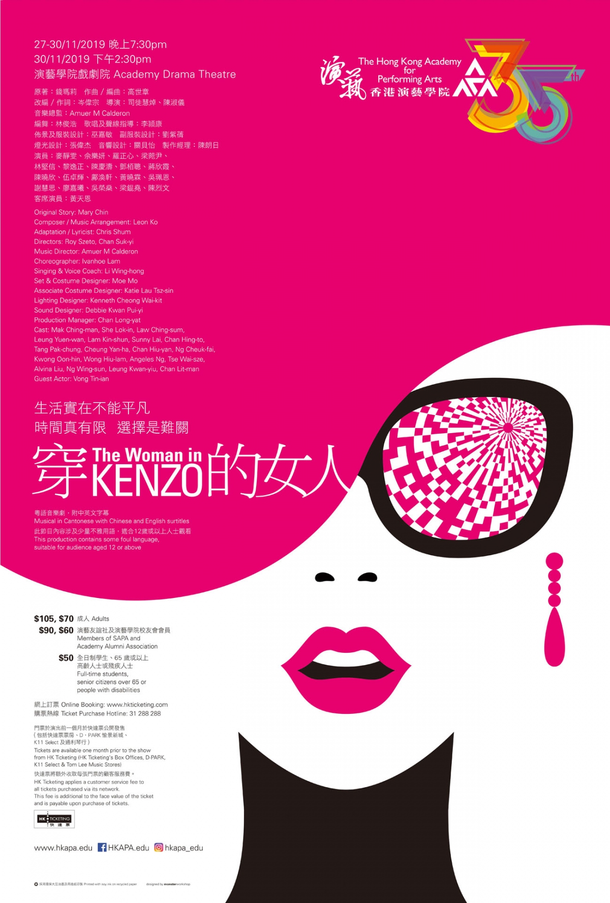 《穿Kenzo的女人》是同名小說唯一的音樂劇改編版本,描寫七十年代的香港,如何經濟起飛,花團錦簇。高世章和岑偉宗與戲劇學院師生攜手獻上,以誌演藝學院35周年之慶。