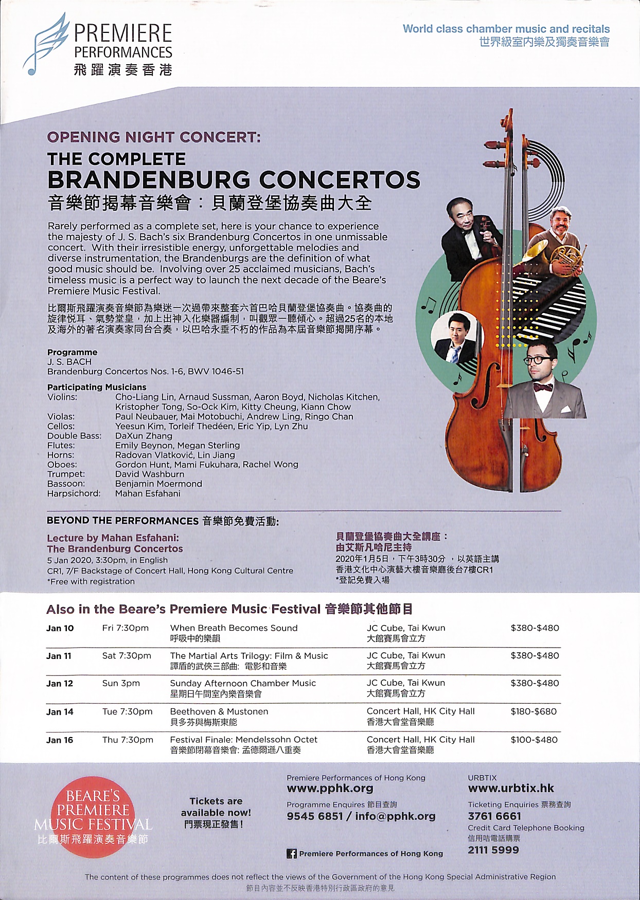 比爾斯飛躍演奏音樂節為你帶來一次難得的音樂體驗,讓你一次過欣賞整套六首的貝蘭登堡協奏曲。此協奏曲的樂器編制十分多樣化, 其難忘的旋律帶著懾人的氣勢, 絕對不容錯過。音樂會由超過25名備受讚譽的演奏家同台合奏,以巴哈永垂不朽的作品為本屆音樂節揭開序幕。