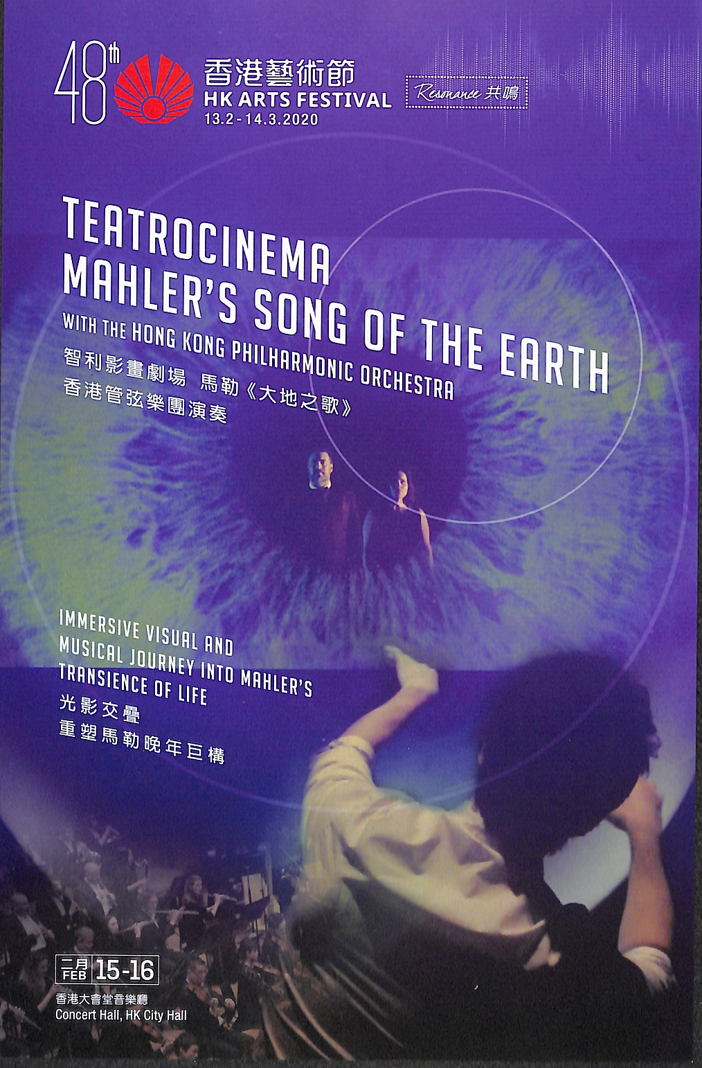 備受讚譽的智利影畫劇場巧妙運用高科技多媒體,於光影交疊的詩意舞台上,重塑馬勒晚年創作的巨構——聲樂交響曲《大地之歌》。智利兩位聲樂名家與影像幻境融為一體,配合由洛杉磯愛樂樂團副指揮博爾托拉米奧利率領的香港管弦樂團,立體呈現作曲家對人生變幻無常之感嘆。樂隊編制雖然一貫龐大,但同時存在室樂的親切感,與人聲配合得天衣無縫,帶領觀眾進入一次充滿視聽震撼的奇妙音樂旅程,全新體驗馬勒的不朽經典。馬勒喪女後於機緣巧合下讀到德譯中國唐詩集《中國笛子》,譜成為六樂章的《大地之歌》,可惜他無緣見證作品首演便離世。終樂章〈送別〉由雙簧管奏出孤寂絕望的旋律,最後由女中音唱出馬勒親題的歌詞,藉春回大地、萬物欣欣向榮之象,表達對人生仍充滿希望。