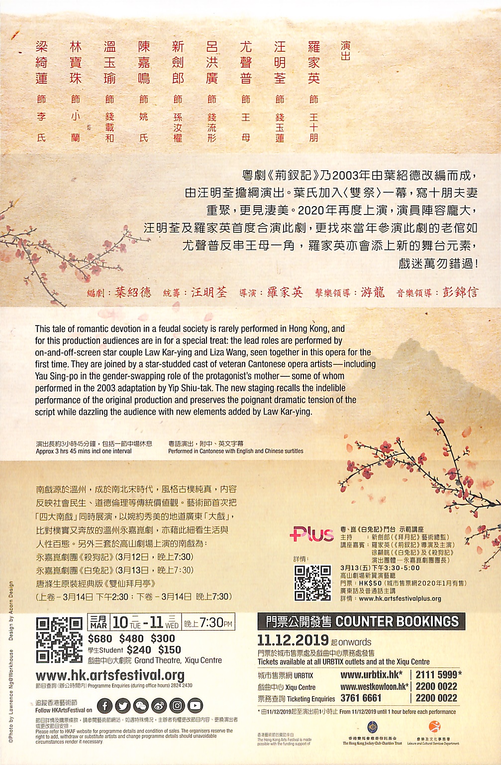 2020年香港藝術節首次把四大南戲同時展演舞台之上:汪明荃、羅家英首次合演的《荊釵記》,二人演繹忠貞不屈的夫婦,令人期待;唐滌生根據《拜月記》改編成淒美的廣東大戲《雙仙拜月亭》,由新劍郎擔任藝術總監,帶領一眾粵劇菁英,演出唐氏的原版本;由溫州永嘉崑劇團製作及演出的《殺狗記》和《白兔記》﹝亦名為《劉智遠白兔記》﹞,前者以兄弟情義為題材,後者寫夫婦悲歡離合及母子相會,格外真摯感人,實在不容錯過。