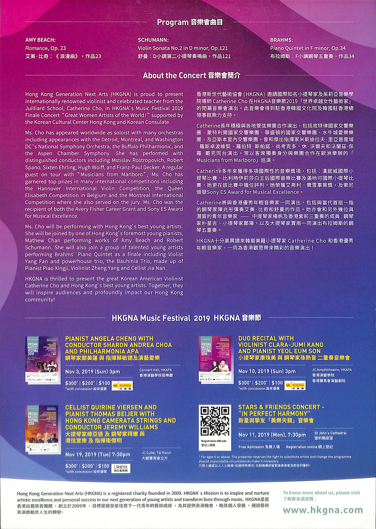 香港新世代藝術協會(HKGNA) 與荷蘭駐港澳總領事館合辦,邀請來自荷蘭的非凡大提琴家維亞遜,在第六屆HKGNA音樂節「歌頌世界卓越女性藝術家」中演出。 維亞遜為多項主要國際大賽得主, 包括羅斯托波維契國際大提琴大賽及赫尔辛基國際大提琴大賽。她亦是首名荷蘭音樂家奪得柴可夫斯基國際音樂比賽大獎,並於1994年 取得 獎項「the Dutch Music Award」,此乃由荷蘭教育、文化及科學部之最高榮譽的獎項。 維亞遜以獨奏家身分於多個樂團合作,包括伯納德·海廷克所帶領的皇家音樂廳管弦樂團、葛濟夫指揮的聖彼得堡愛樂樂團,以及海因里希·席夫帶領的維也納室內樂團等等。