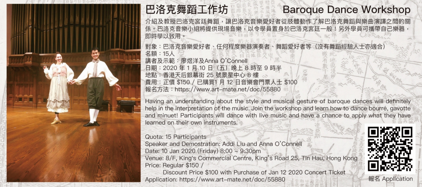 介紹及教授巴洛克宮廷舞蹈,讓巴洛克音樂愛好者從肢體動作了解巴洛克舞蹈與樂曲演譯之間的關係。巴洛克音樂小組將提供現場音樂,以令學員置身於巴洛克宮廷一般!另外學員可攜帶自己樂器,即時學以致用。