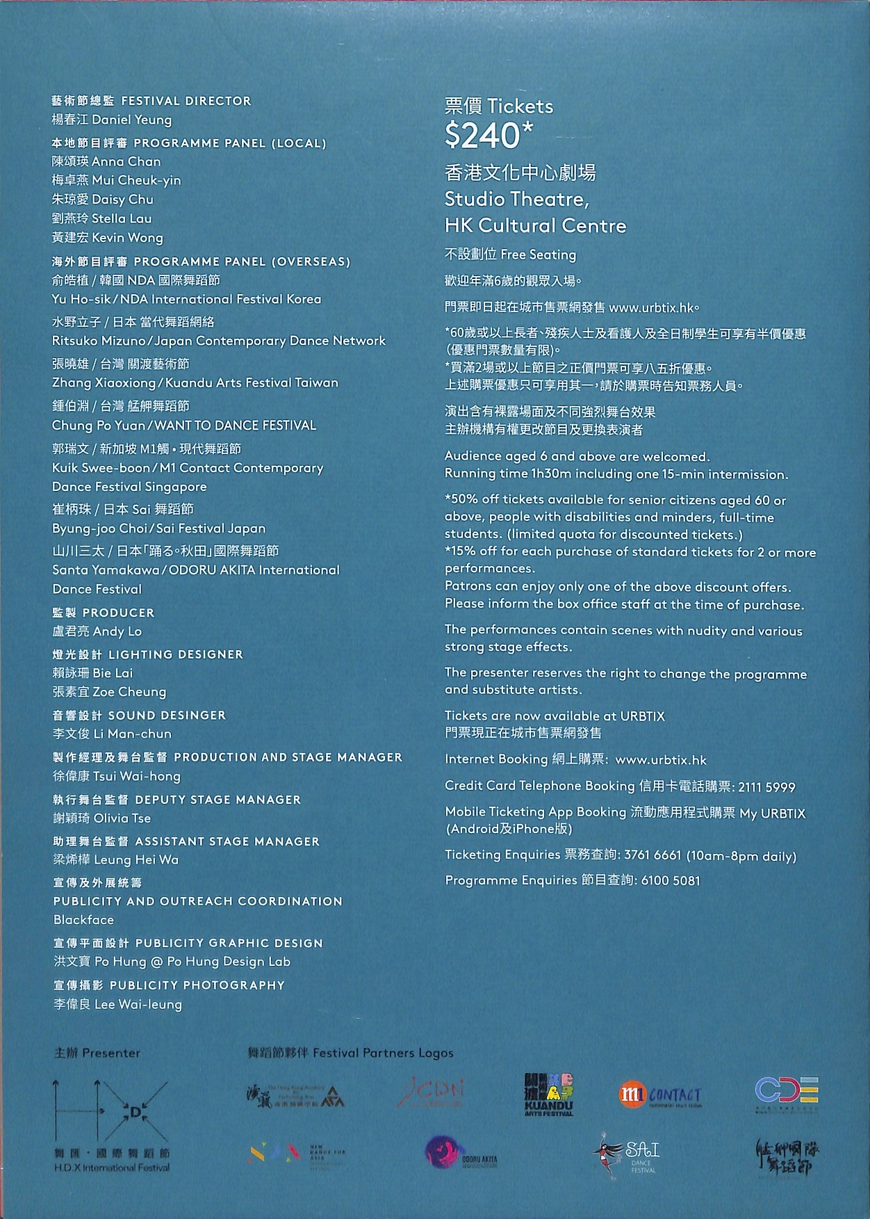 此作品由2019香港藝術節委約及製作,於香港賽馬會當代舞蹈平台首演。
