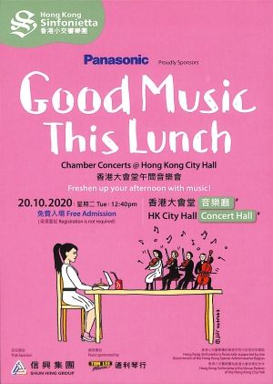 由於現時香港大會堂低座大堂仍不能舉辦音樂會,因此10月20日(星期二)的「Panasonic Proudly Sponsors: Good Music This Lunch」 午間音樂會將移師到香港大會堂音樂廳舉行。誠邀大家與我們共享美樂一小時,在忙碌的一天中,趁著午餐時間輕鬆一下!