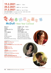 麥兜一家與春田花花幼稚園仝人齊齊整整迎春接福賀新年! 音樂廳裡有聖桑的《動物嘉年華》,有雞有鵝有魚,有動畫有美樂,有歡笑有窩心,就這樣暖暖的溫馨的共您享樂迎春。德伏扎克 《狂歡節》序曲,作品92韋華第 《四季》: 春林姆斯基-高沙可夫 《西班牙隨想曲》,作品34聖桑 《動物嘉年華》貝多芬/鄺展維 貝多芬交響曲大串燒