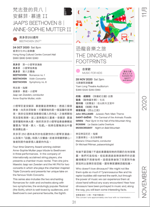 有誰不愛恐龍?不過如果暴龍和牠的同類仍在地球稱霸,我們可能怕怕。但如果可以透過音樂與牠們作近距離接觸就不用害怕吧。這個音樂會除了可欣賞到作曲家如何以音樂形容恐龍,還有專家講解恐龍知識。約翰‧威廉斯《侏羅紀公園》主題聖桑《動物嘉年華》:化石葛利格《皮爾金》:在山妖大王宮中羅西尼《賊鵲》序曲穆索斯基《荒山之夜》