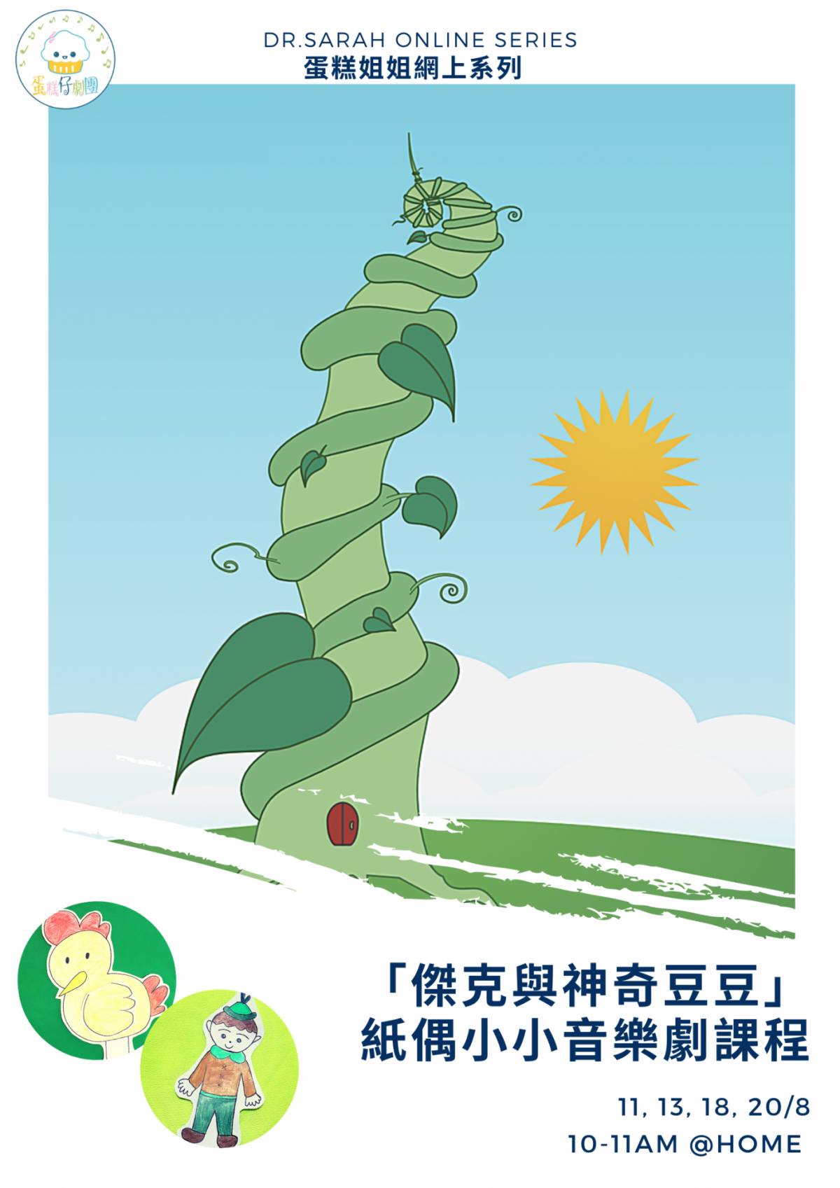 改編自英國『傑克與豌豆』童話,蛋糕姐姐將會與小朋友以趣味手工製作故事人物紙偶,並配以原創廣東話兒歌。讓小朋友一邊唱歌,一邊以紙偶演出童話故事。課堂最後設有Zoom錄影小表演,並會剪輯小表演送給小朋友作留念。