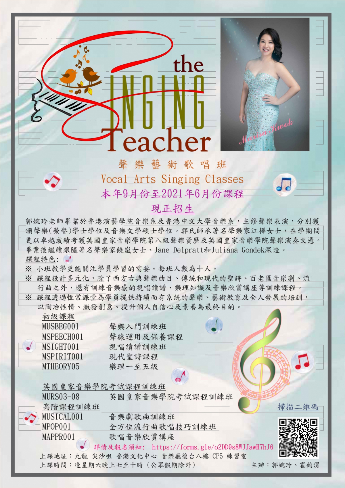 - 導師熱愛音樂及教學,講解清晰,擁有多年豐富的教學和表演經驗,更曾獲多項音樂專業資歷。其門生於各項國際公開聲樂比賽及香港學校音樂節中獲獎無數。