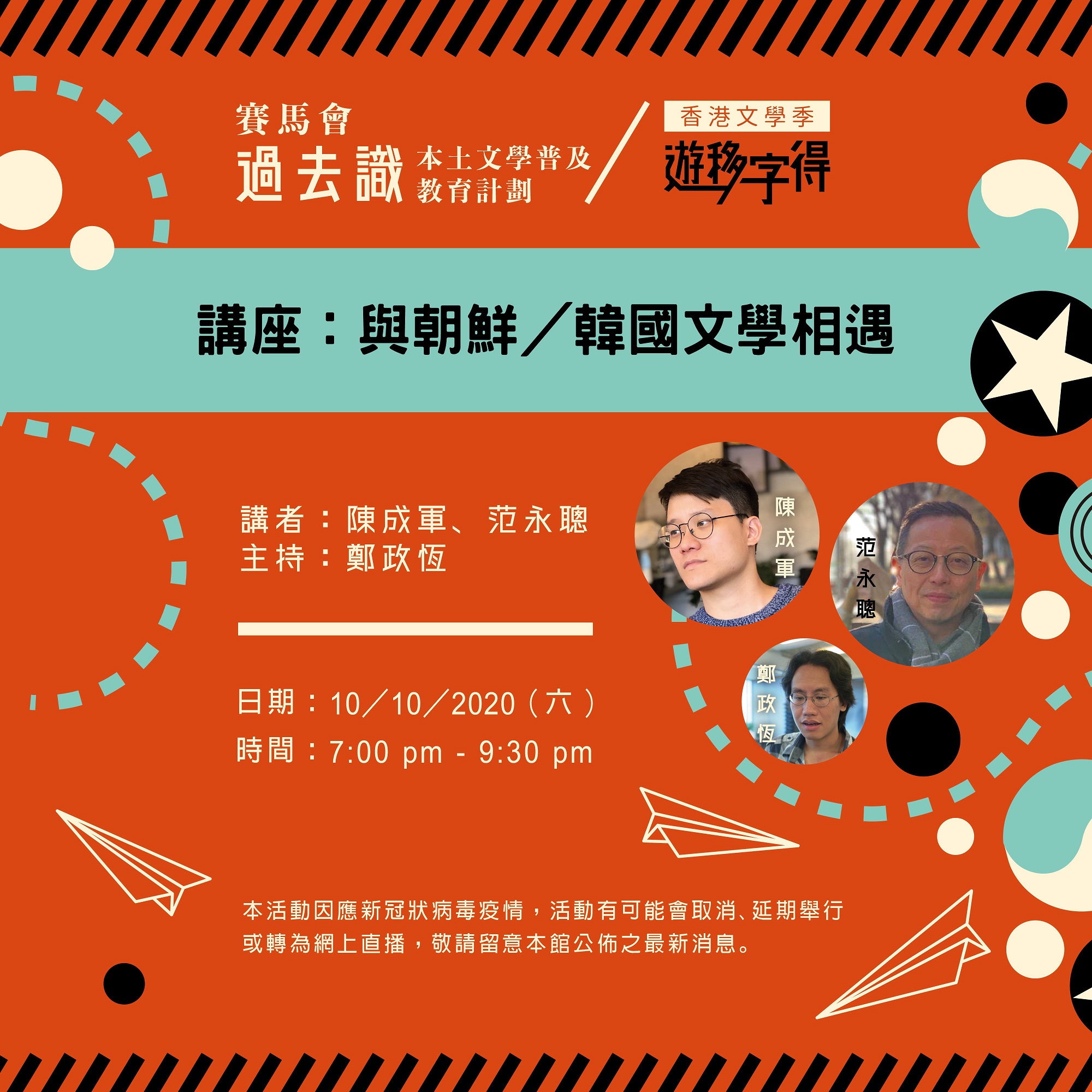 本活動因應新型冠狀病毒疫情,活動有可能會取消、延期舉行或轉為網上直播,敬請留意本館公佈之最新消息。