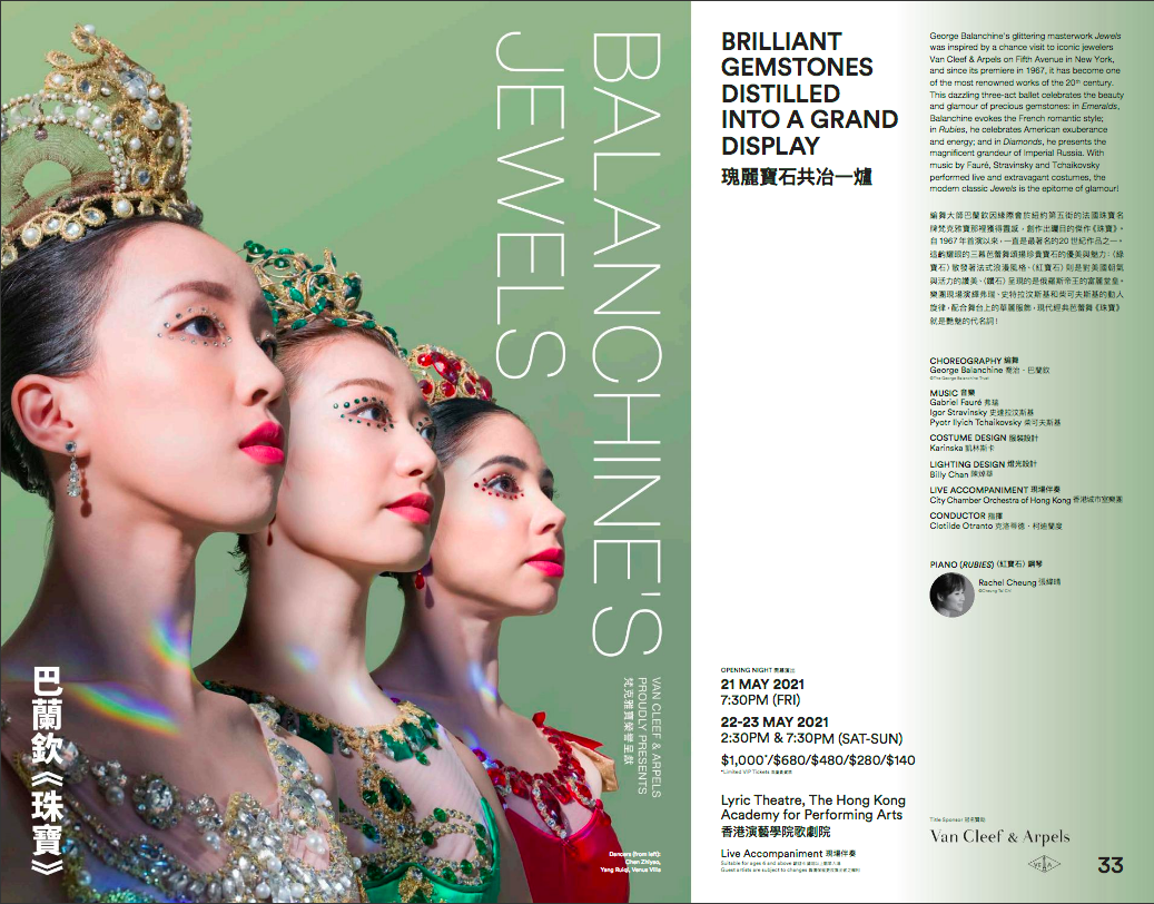 編舞大師巴蘭欽因緣際會於紐約第五大道上的法國珠寶名牌Van Cleef & Arpels 梵克雅寶那裡獲得靈感,創作出矚目的傑作《珠寶》。自1967年首演以來,一直是最著名的二十世紀作品之一。這齣耀眼的三幕芭蕾舞頌揚珍貴寶石的優美與魅力:〈綠寶石〉散發著法式浪漫風格、〈紅寶石〉則是對美國朝氣與活力的讚美、〈鑽石〉呈現的是俄羅斯帝王的富麗堂皇。樂團現場演繹弗瑞、史特拉汶斯基和柴可夫斯基的動人旋律,配合舞台上的璀燦服飾,現代經典芭蕾舞《珠寶》就是艷魅的代名詞!
