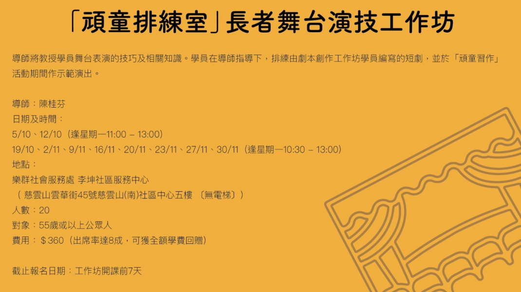 導師將教授學員舞台表演的技巧及相關知識。學員在導師指導下,排練由劇本創作工作坊學員編寫的短劇,並於「頑童習作」活動期間作示範演出。