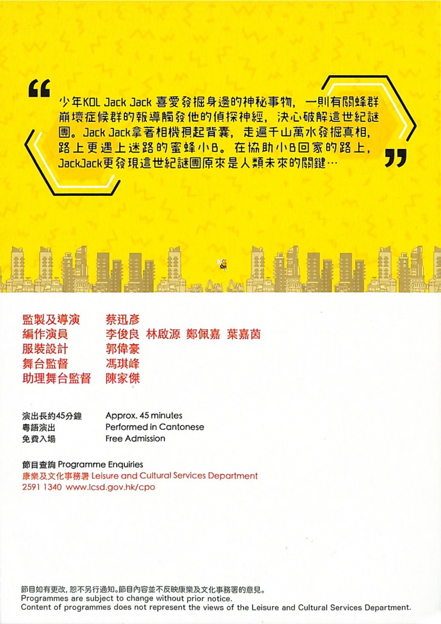 當代舞蹈《天梯II》動藝2020年10月24日(六)4pm — 5pm景林鄰里社區中心爵士音樂會黃德聰、雷柏熹、林知秋2020年10月31日(六)12:15pm — 1:15pm坑口社區會堂兒童偶劇《呢班Bees蜂癲世界》德思戲劇教育工作室2020年11月28日 (六)12nn — 12:45pm健彩社區會堂