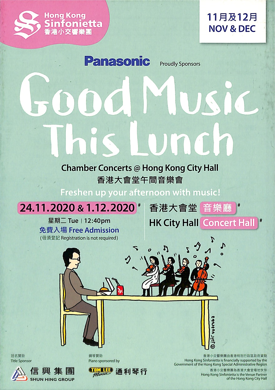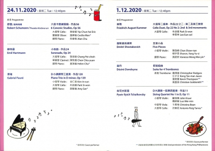 香港小交響樂團於香港大會堂定期舉行的午間音樂會,以音樂洗滌心靈,讓大家在忙碌的一天中,趁著午餐時間輕鬆一下,一邊享用午餐,一邊欣賞美妙的室樂演奏。庫瑪 大提琴二重奏,作品22之二:第二及第三樂章蕭斯達高維契 五首小品董丹 長號組曲柴可夫斯基 D大調第一弦樂四重奏,作品11