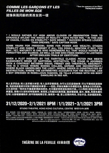 《小飛俠》改篇自同名經典童話,用視覺上的瘋狂抗衡荒誕,讓身體碰撞、擴大、解構。致敬川久保玲的時裝美學 — 用黑色襯托光明;以破壞建構秩序;用不對稱解釋日常。像男孩一樣,穿上反叛的時尚,吊在半空,用身體說故事。