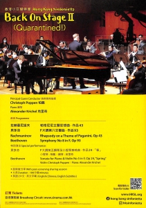 拉赫曼尼諾夫之帕格尼尼主題狂想曲,蕩氣迥腸,百聽不厭,觀眾可看到鋼琴家克里奇在指揮柏鵬帶領下,一氣呵成演繹這首鋼琴經典。而柏鵬亦會指揮樂團一起演奏貝多芬的第八交響曲,在激盪過後仿似看見廣闊無際的地平線。而本身亦是一位小提琴家的柏鵬,亦會與克里奇加奏貝多芬著名的鋼琴及小提琴奏鳴曲,「春」 ─ 面對著「疫」境,音樂再次帶來了久違的豁然開朗。
