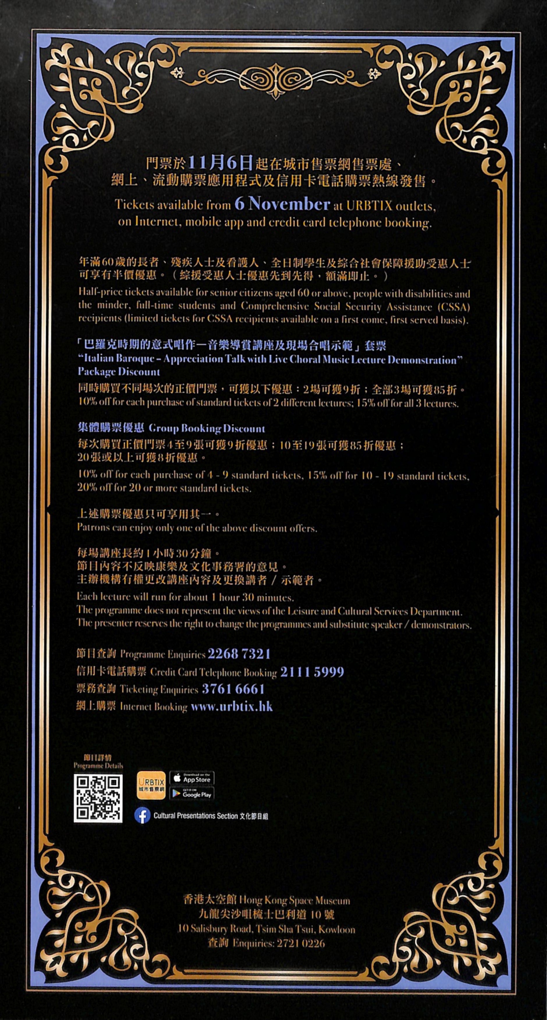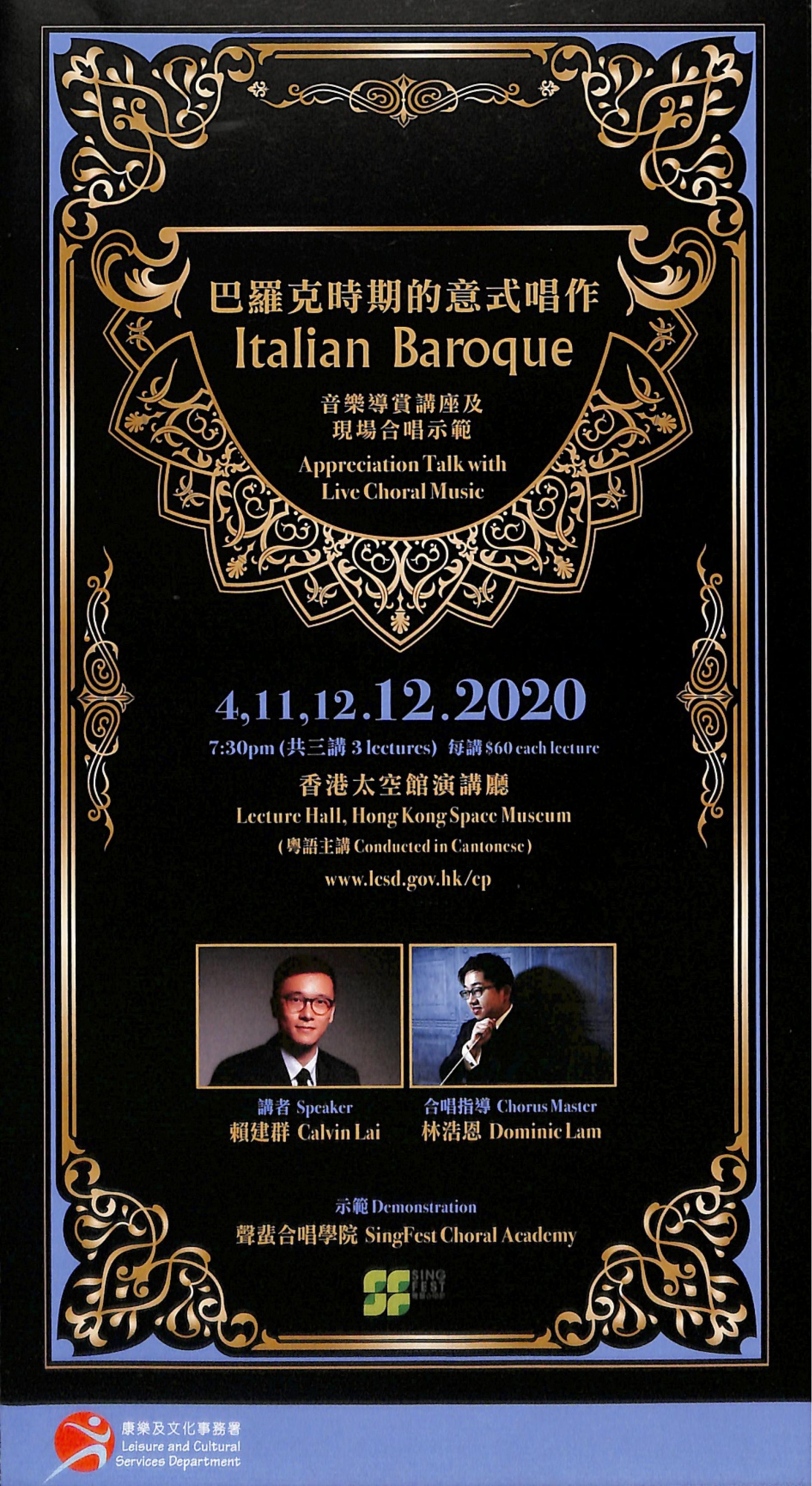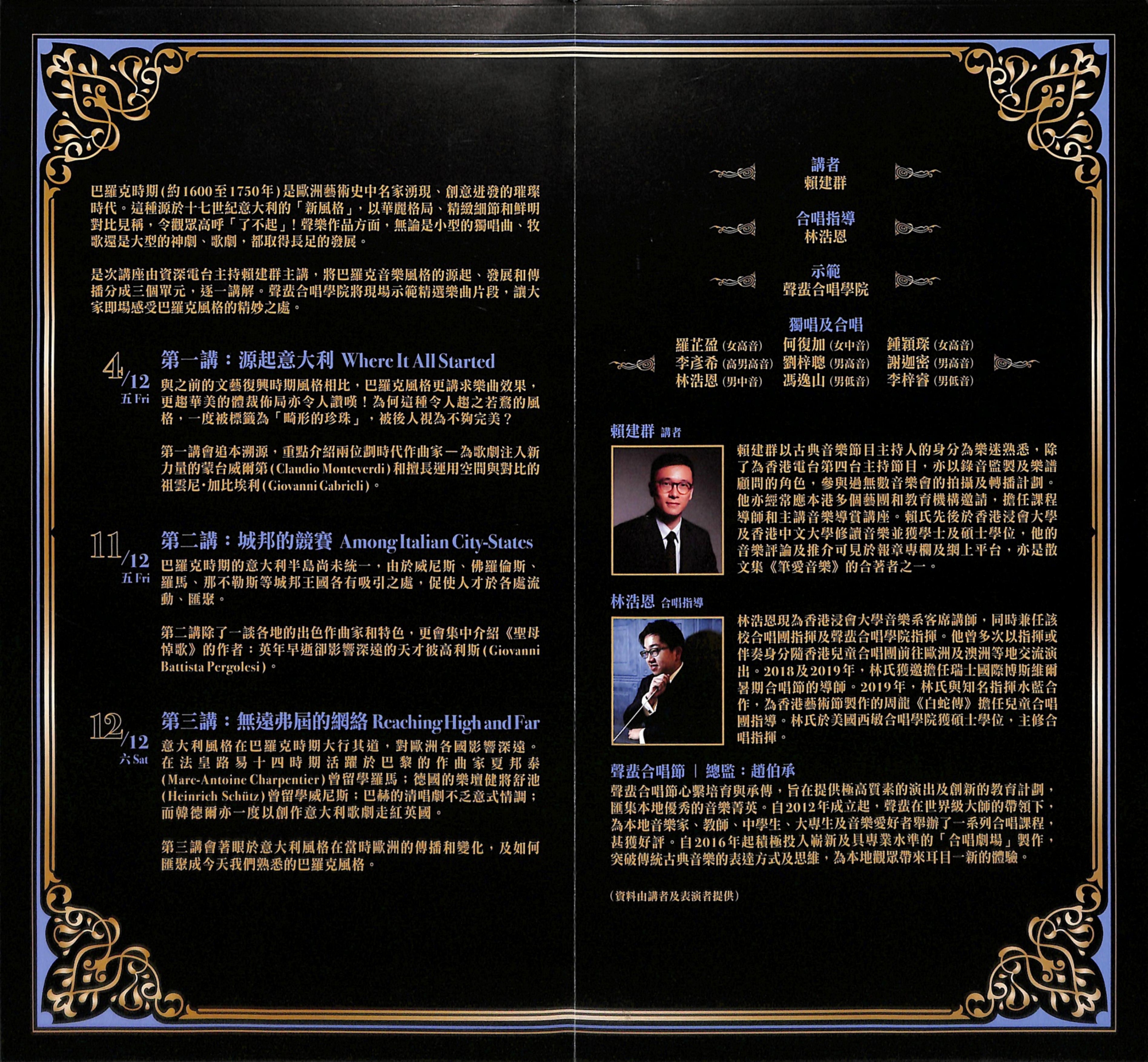 是次講座由資深電台主持及音樂教育家賴建群主講,將巴羅克音樂風格的源起、發展和傳播分成三個單元,逐一講解。聲蜚合唱學院將現場示範精選樂曲片段,讓大家即場感受巴羅克風格的精妙之處。