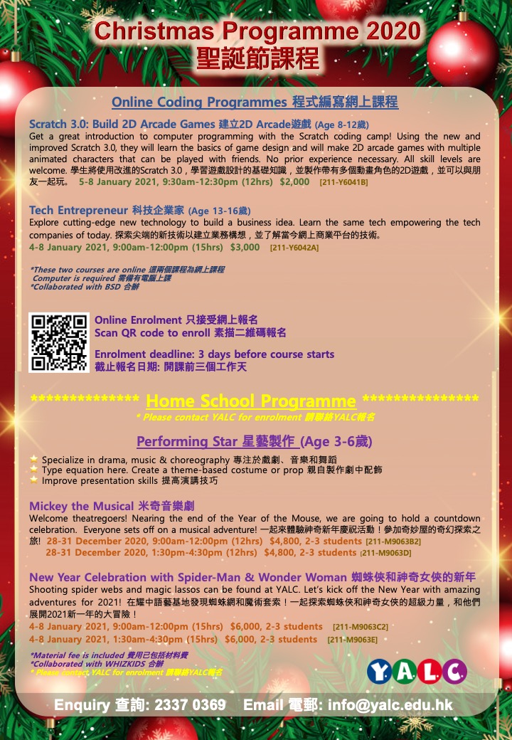 *There are minimum registration number for each class , if the class doesn't reach the minimum, the class will be cancelled, YALC will contact you to make arrangement accordingly, if there's no alternative option can be made, the course fee will be refunded to you.