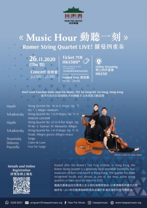羅曼四重奏由四位⾹港⼟⽣⼟長的⾳樂家組成,以⾹港獨有的盧⽂氏樹蛙命名。樂隊於2013年初⾸演後瞬受眾人認可並活躍於本港及海外的室內樂組合。羅曼四重奏熱衷推動本港及亞洲新⼀代的室內樂⽂化,致⼒服務社區,成⽴後⼀直與⾹港遊樂場協會保持合作長達五年,定期向兒童提供免費的⾳樂⼯作坊及演出。***名額有限,只限預約,請即報名*** 已報名的參加者將會收到一封確認電郵,包括付款詳情。