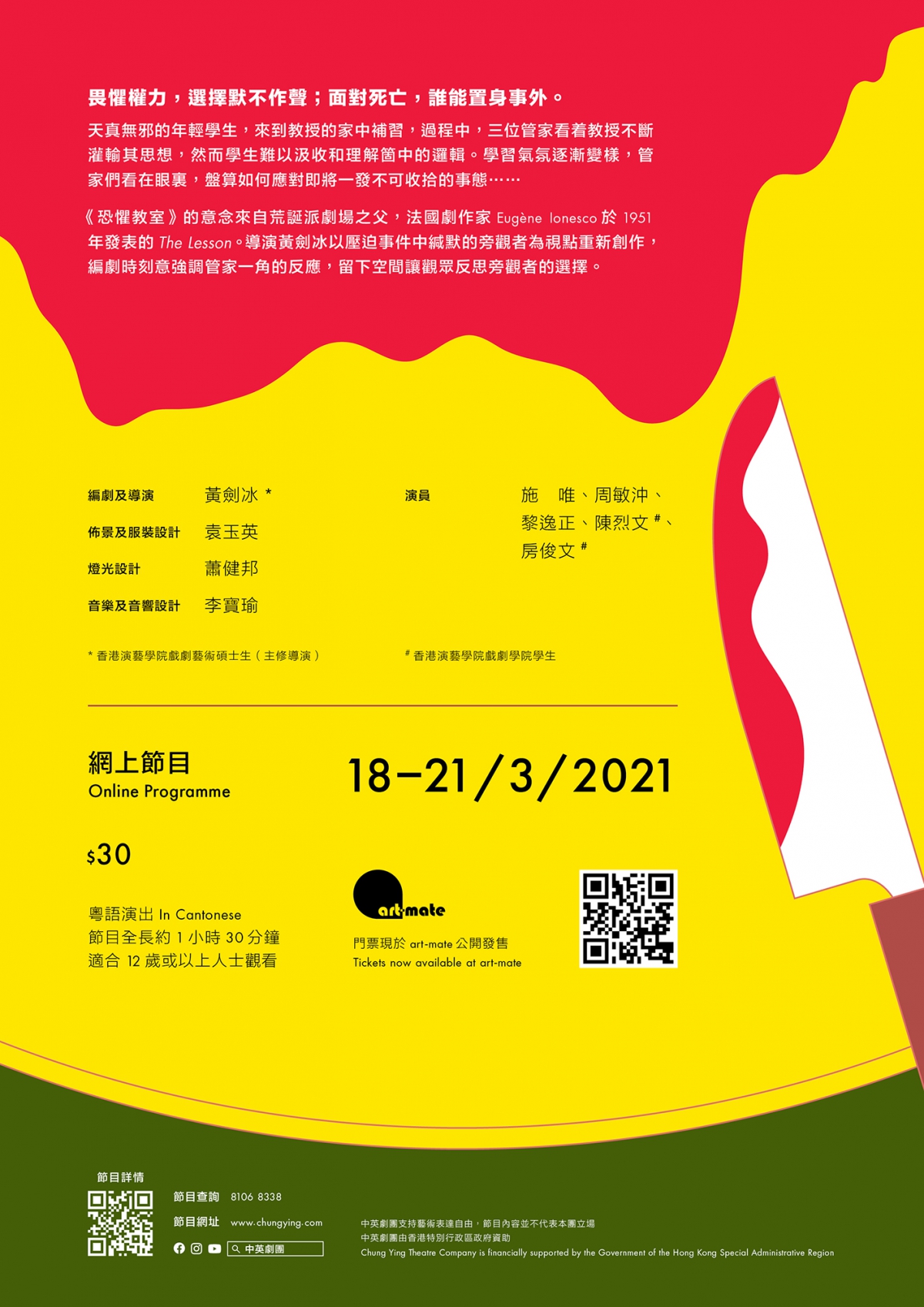 是次畢業作品《恐懼教室》的意念來自荒誕派劇場之父,法國劇作家Eugène Ionesco於1951年發表的The Lesson。導演黃劍冰以壓迫事件中緘默的旁觀者為視點重新創作,編劇時刻意強調管家一角的反應,留下空間讓觀眾反思旁觀者的選擇。