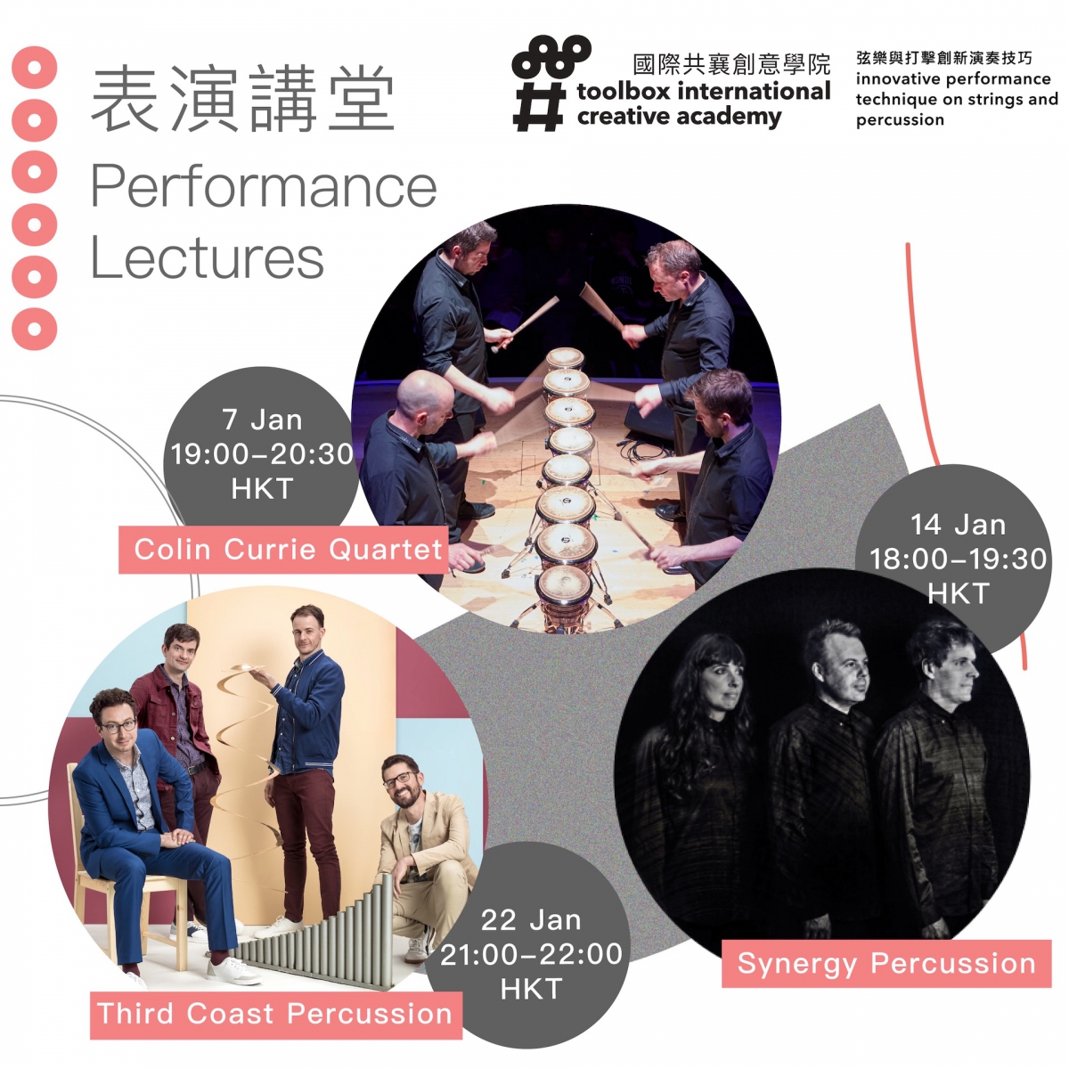 第一堂表演講堂將邀請英國的著名當代敲擊樂界勁旅— 柯林 · 卡瑞四重奏,以錄像形式演出精選敲擊樂章,包括知名極簡主義作曲家史蒂夫.萊許的作品《擊鼓》(第一部份)、安迪.亞基浩《Pillar IV》,以及戴夫.馬里克的鍵盤四重奏新作等等,屆時導師將會與大家跨時區線上會面,與你共賞獨家演奏會!
