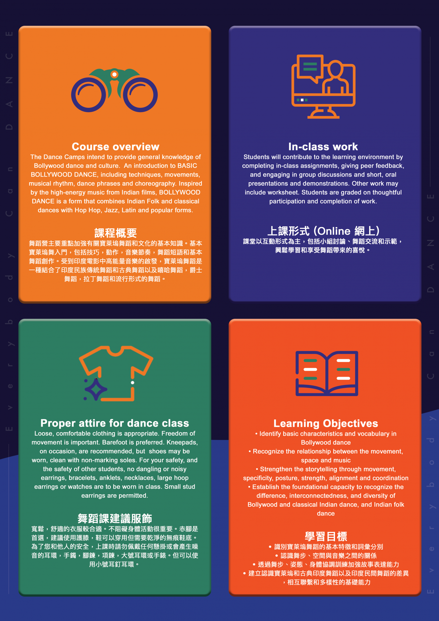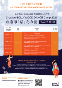 舞蹈營主要重點加強有關寶萊塢舞蹈和文化的基本知識。基本寶萊塢舞入門,包括技巧,動作,音樂節奏,舞蹈短語和基本舞蹈創作。受到印度電影中高能量音樂的啟發,寶萊塢舞蹈是一種結合了印度民族傳統舞蹈和古典舞蹈以及嘻哈舞蹈,爵士舞蹈,拉丁舞蹈和流行形式的舞蹈。