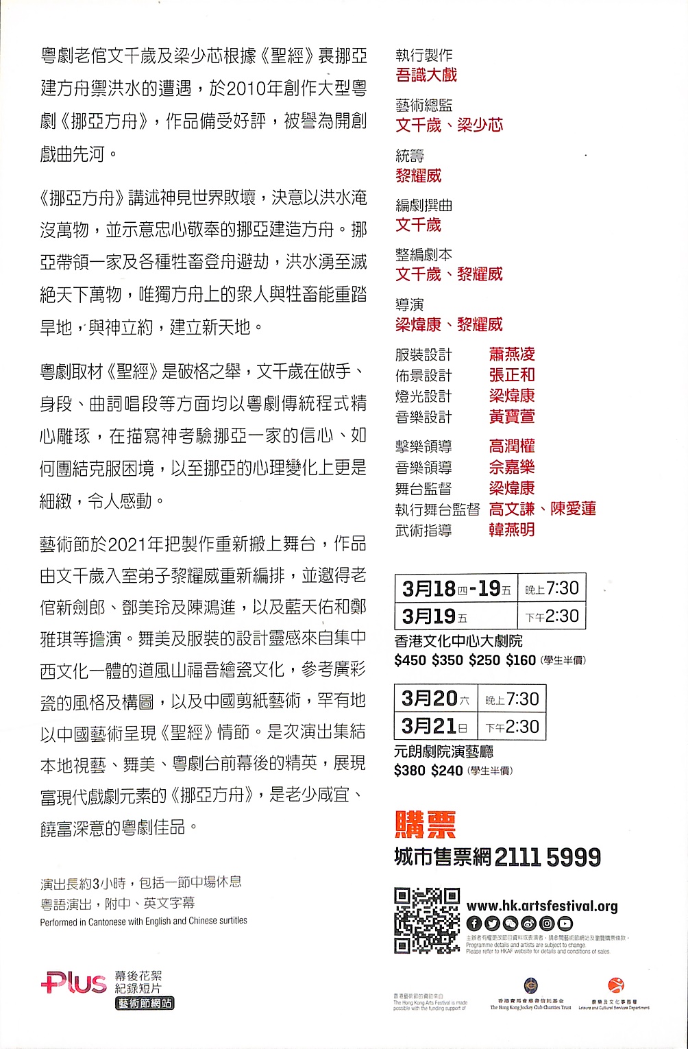 術節將2010年由文千歲及梁少芯創作的粵劇《挪亞方舟》重新搬上舞台,由梨園老倌新劍郎、鄧美玲、陳鴻進、藍天佑和鄭雅琪擔演,與本地年青藝術家獻上這齣情節高潮迭起、曲詞優美動人,以現代戲劇手法打造的粵劇佳品。老少咸宜,同時饒富深意。