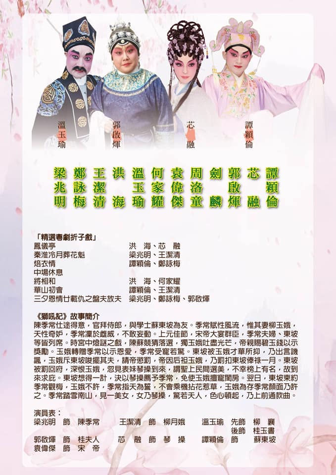 陳季常仕途得意,官拜侍郎,與學士蘇東坡為友。季常賦性風流,惟其妻柳玉娥,天性奇妒,季常凜於雌威,不敢妄動。上元佳節,宋帝大宴群臣,季常夫婦、東坡等皆列席。時宮中燈謎之戲,陳蘇競猜落選,獨玉娥吐盡光芒,帝親賜碧玉錢以示獎勵。玉娥轉贈季常以示恩愛,季常受寵若驚。東坡被玉娥才華所抑,乃出言譏諷,玉娥斥東坡唆擺其夫,請帝懲罰,帝因后袒玉娥,乃罰扣東坡俸祿一月。東坡被罰回府,深恨玉娥,忽見表妹琴操到來,謂聖上民間選美,不幸榜上有名,故到來求庇。東坡想得一計,決以琴操薦予季常,免使玉娥擅寵閨房。翌日,東坡柬約季常觀梅,玉娥不許,季常指天為誓,不會乘機拈花惹草,玉娥為存季常顏面乃許之。季常踏雪南山,見一美女,女乃琴操,驚若天人,色心頓起,乃上前通款曲。