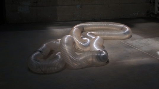 🔻《πTon/2》是一個聲音裝置,主體是一條閉合的環狀軟管,內置摩打使其扭動搖晃,移動方式既自然且無法預測。軟管扭動時的聲音取樣自低音單簧管,隨軟管移動而改變,通過內置的擴音器,幻化成樂章。當裝置緩慢收縮和擴張,會產生恍似深呼吸的沉實聲音;當移動變得急速,則會產生尖銳特殊的聲音,如神經般沿管道流洩至整個空間。