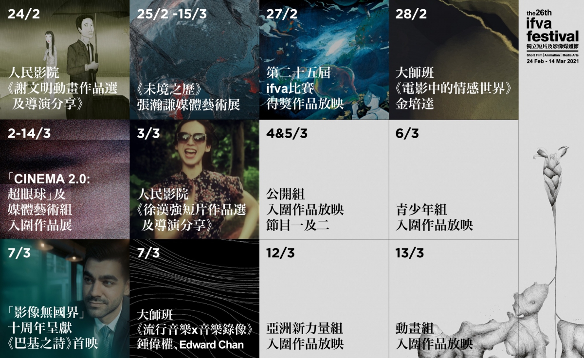 兩場大師班將就影像與音樂作深入討論:金像獎配樂大師金培達將以「母題旋律」分析電影配樂與影像的敘事方式;音樂錄像導演鍾偉權則聯同音樂製作人 Edward Chan 對談流行音樂與音樂錄像的關係。兩場網上「人民影院」分別是動畫師謝文明及導演徐漢強的短片回顧,二人同為台灣金馬獎及ifva 得獎者。影像教育計劃「影像無國界」的少數族裔學員,與導演陳瀚恩聯手製作十周年短片《巴基之詩》刻劃在地少數族裔青年的生活與生存。