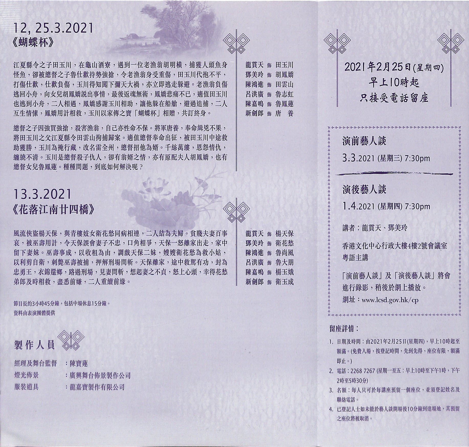 「演前藝人談」及「演後藝人談」將會進行錄影,稍後於網上播放。