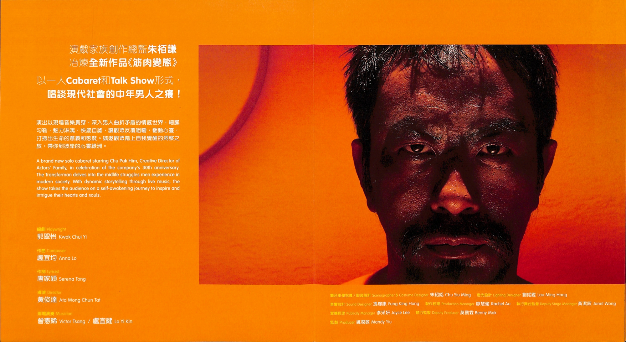 ⟁演戲家族30周年⟁朱栢謙《筋肉變態》獨腳Cabaret Talk 演戲家族創作總監朱栢謙冶煉全新作品《筋肉變態》,以一人Cabaret和Talk Show形式,唱談現代社會的中年男人之癢!演出以現場音樂貫穿,深入男人曲折矛盾的情感世界,細膩勾勒,魅力淋漓,快感自謔,讓觀眾反覆咀嚼,翻動心靈,打撈出生命的意義和態度。誠邀觀眾踏上自我覺醒的洞察之旅,帶你到彼岸的心靈綠洲。