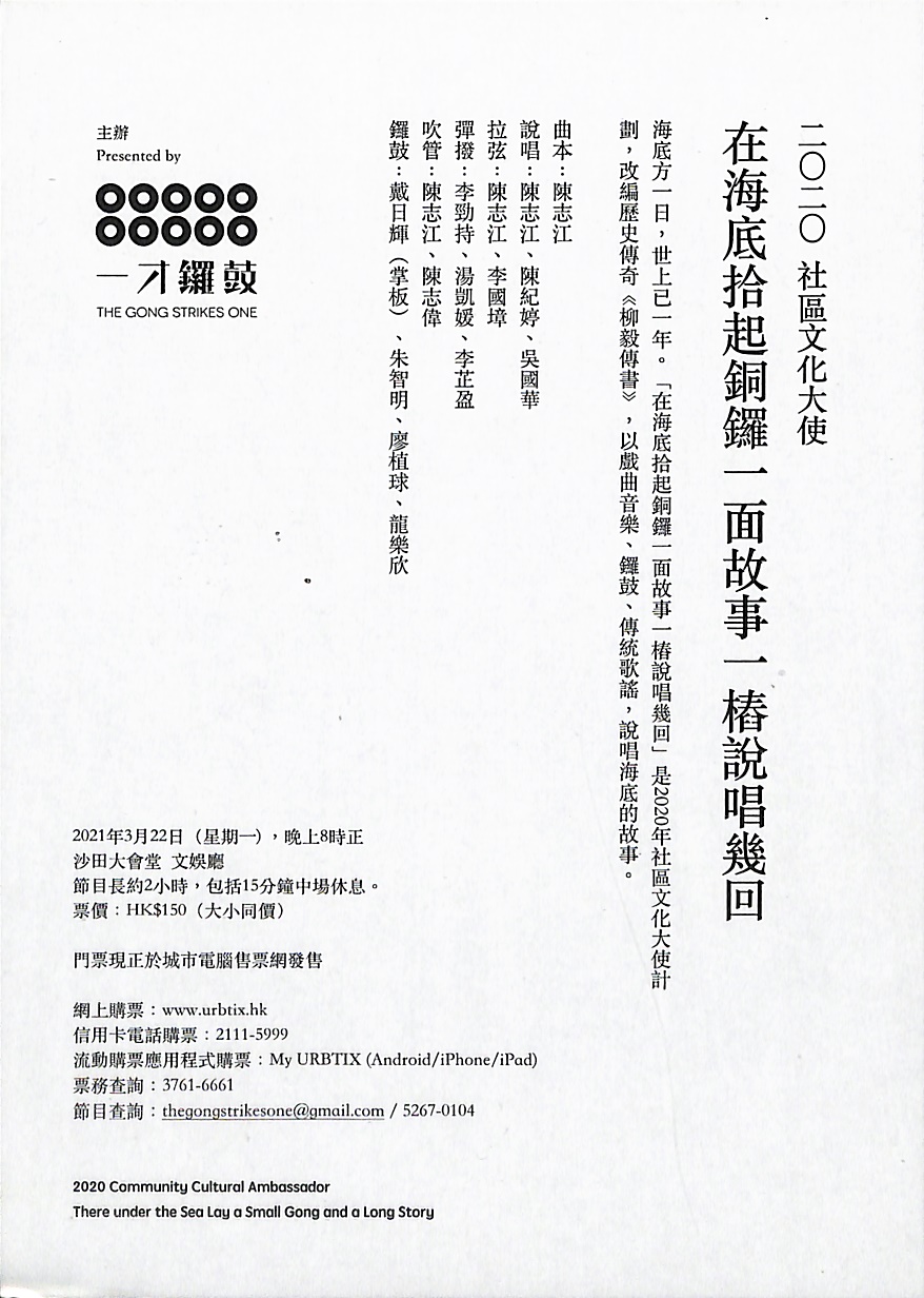 海底方一日,世上已一年。「在海底拾起銅鑼一面故事一樁說唱幾回」是 2020年社區文化大使計劃,改編歷史傳奇《柳毅傳書》,以戲曲音樂、鑼鼓、傳統歌謠,說唱海底的故事。節目長約120分鐘,包括一節中場休息。