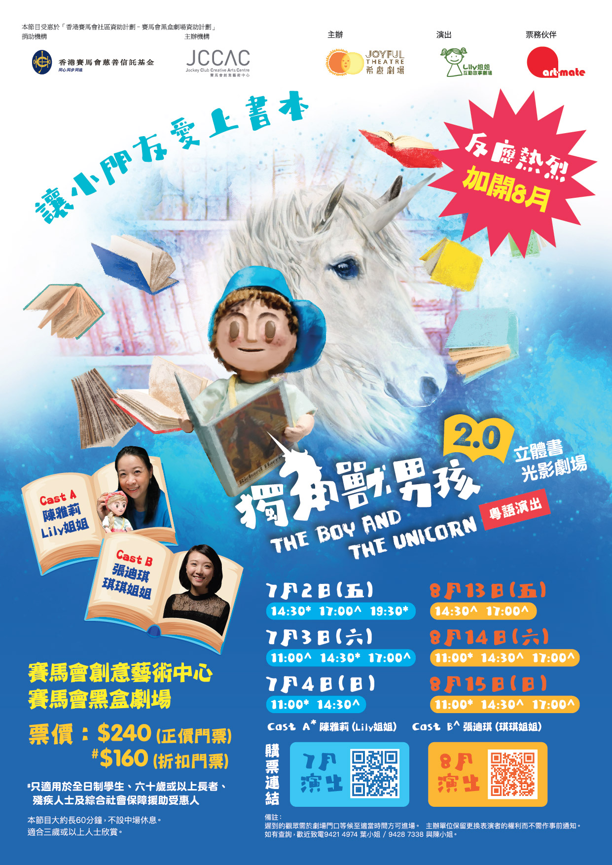 7月2-4日《獨角獸男孩2.0》 購票反應熱烈,只尚餘少量門票,現加開 8月13-15日8場演出,並推出「暑期優惠」,由即日可以最最最優惠票價訂購門票,兼獨享【後台導賞體驗】(參加反應熱烈,所有後台導賞場次已滿額,多謝支持),把握機會,快啲訂票啦~