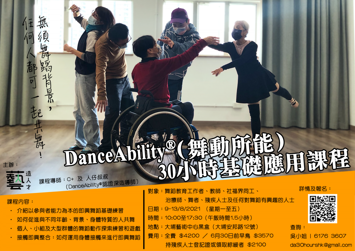 在兩位舞動所能認證深造導師 (Certified DanceAbility® Master Teacher)帶領的練習下,參加者將學習舞動所能的基本練習和理論。本課程適合舞蹈教育工作者、教師、社福界同工、治療師、舞者、殘疾人士及任何對舞蹈有興趣的人士參與,無須擁有舞蹈背景。課程中,參加者能享受沉浸式即興舞蹈學習經驗,而學習所得亦可應用於帶領共融及即興舞蹈活動。