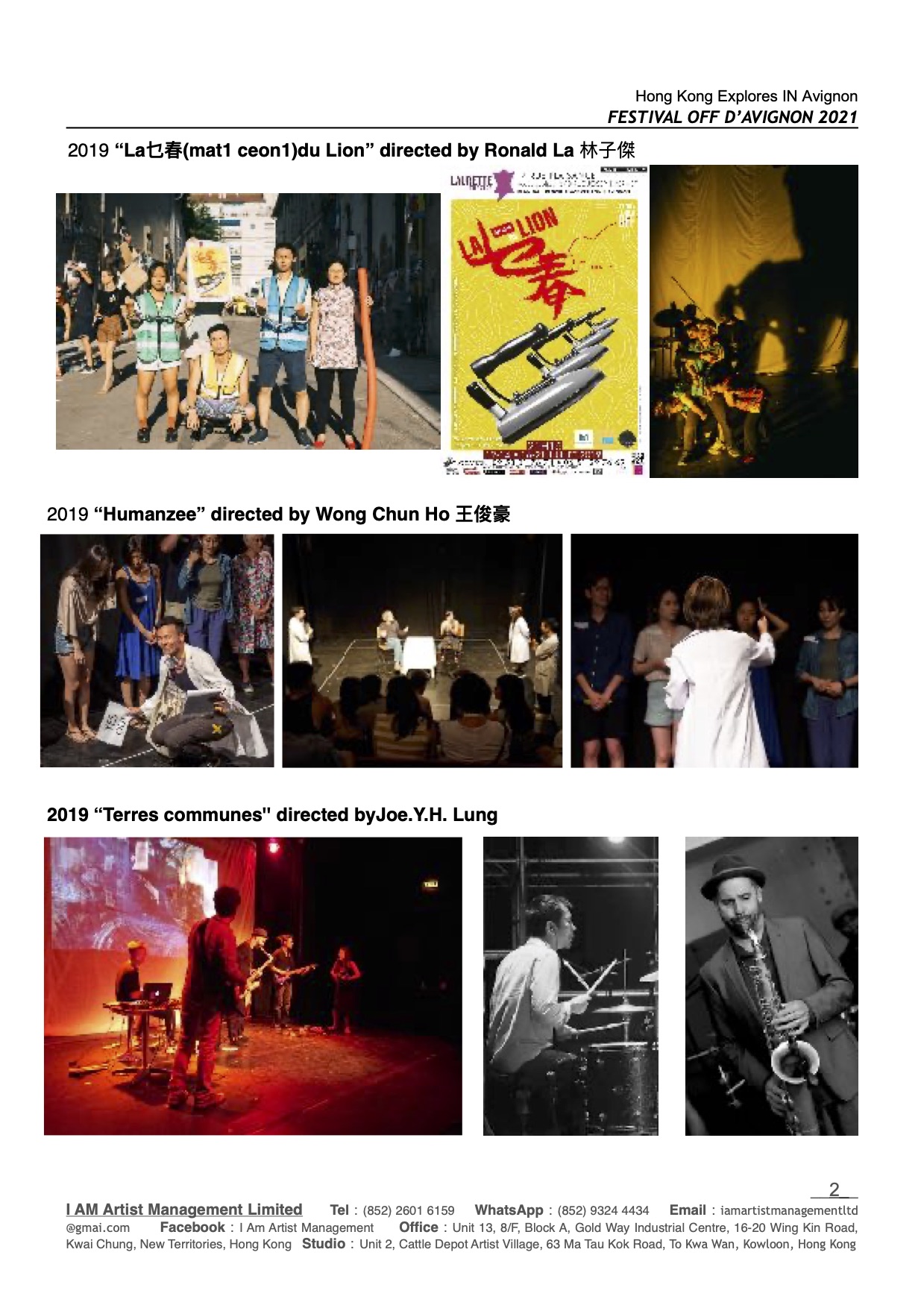 今年是 I AM Artist Management Limited 第4年參與於法國舉辦的[外亞維儂藝術節]。這次法國之旅真的來得不易,在重重困難下,需要延期及大幅修改表達手法,亦要經過多重的申請,預備大量文件。但我們仍一直堅持,在疫情影響下,我們設計了可讓參加者自由參與的日期及時間,設計適合自己的行程。在香港完成工作坊後,導師會跟大家並肩同行,創作能展現香港多個面向的作品。為顧及疫情下安心進行藝術交流,展演區會分佈在空氣流通的亞維儂古城牆內,同時接受未能出國的參加者在香港以另一種方式參與。務求讓更多香港人能參與這國際級藝術界盛事。