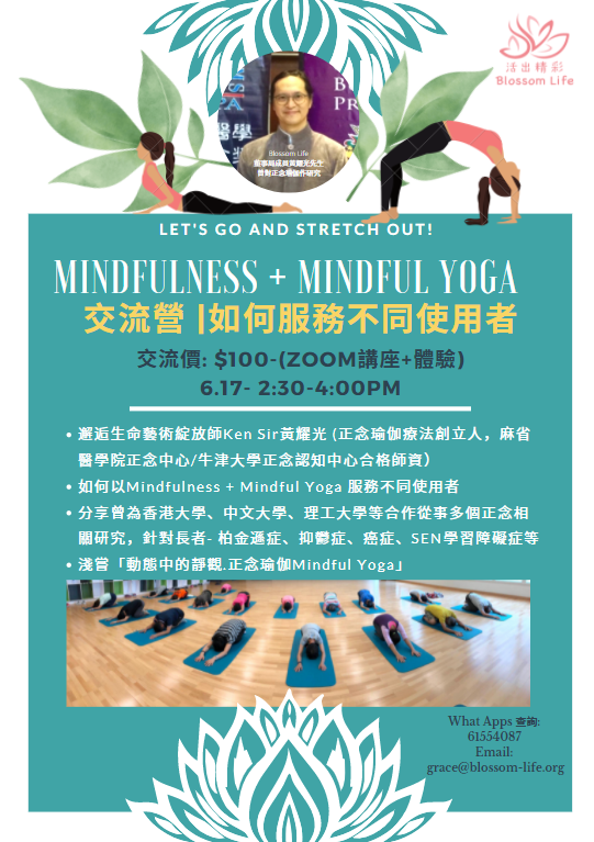 對象:社福仝工及綻放伙伴 🔻 邂逅生命藝術綻放師Ken Sir黃耀光 (正念瑜伽療法創立人,麻省醫學院正念中心/牛津大學正念認知中心合格師資)🔻 如何以Mindfulness + Mindful Yoga 服務不同使用者🔻 分享曾為香港大學、中文大學、理工大學等合作從事多個正念相關研究,針對長者- 柏金遜症、抑鬱症、癌症等🔻 淺嘗「動態中的靜觀.正念瑜伽Mindful Yoga」如椅子瑜伽,站立式等體驗