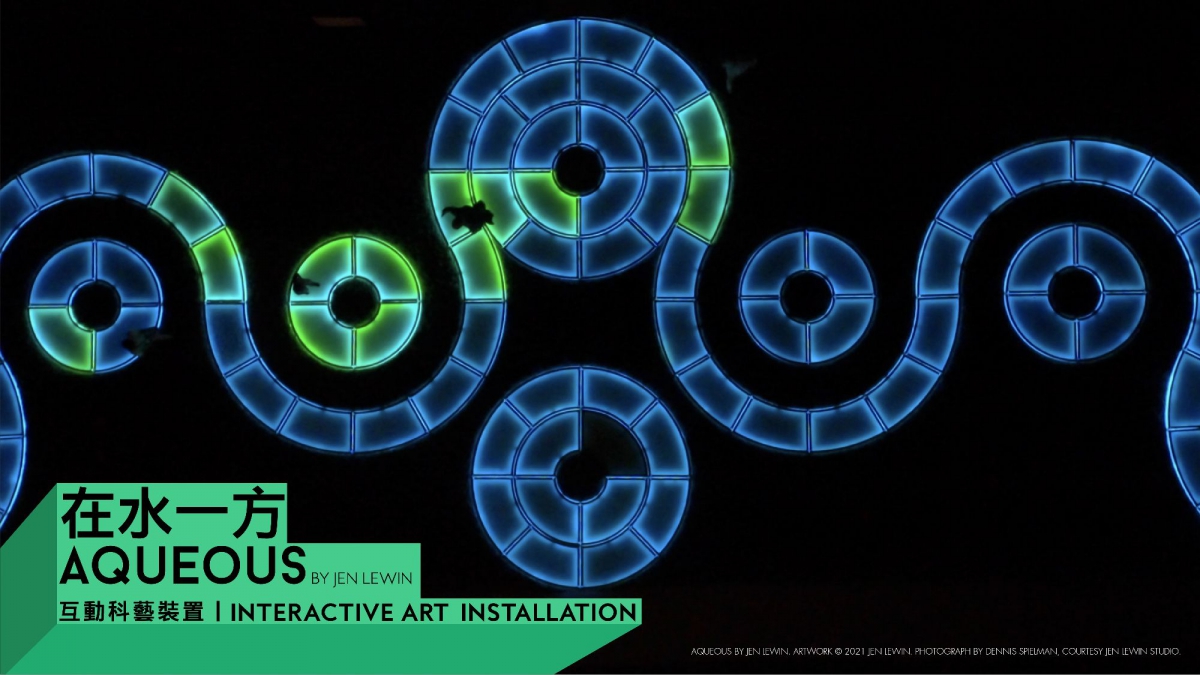 《在水一方》由數以百計的電子組件組合而成,變化出不同圖案。藝術家珍・利維為每塊組件編寫能感知人類觸感的程式,只要跳進《在水一方》,你就會和其他人連繫一起,共創變化萬千的光影舞台。